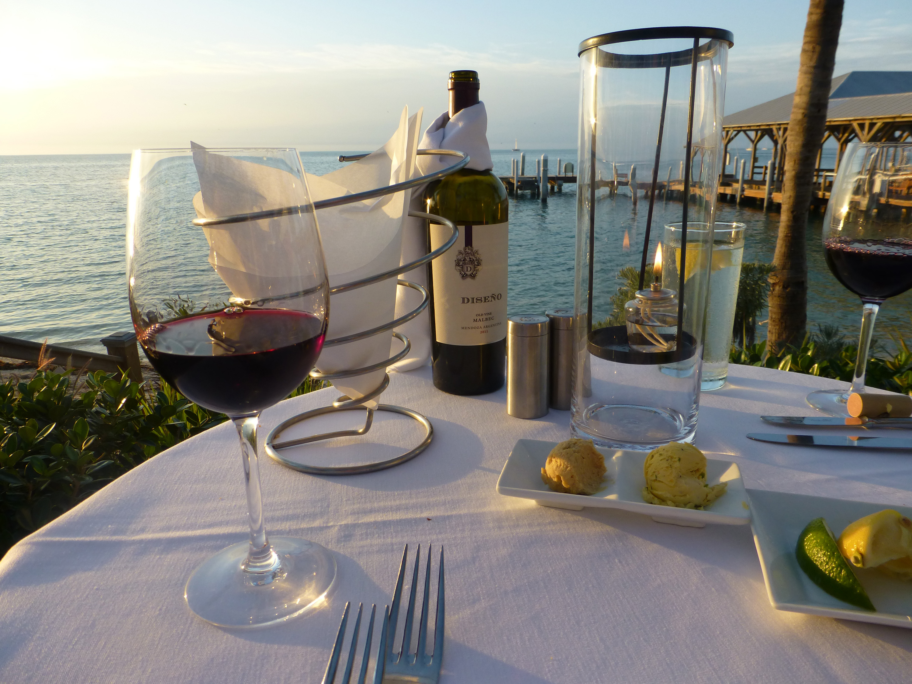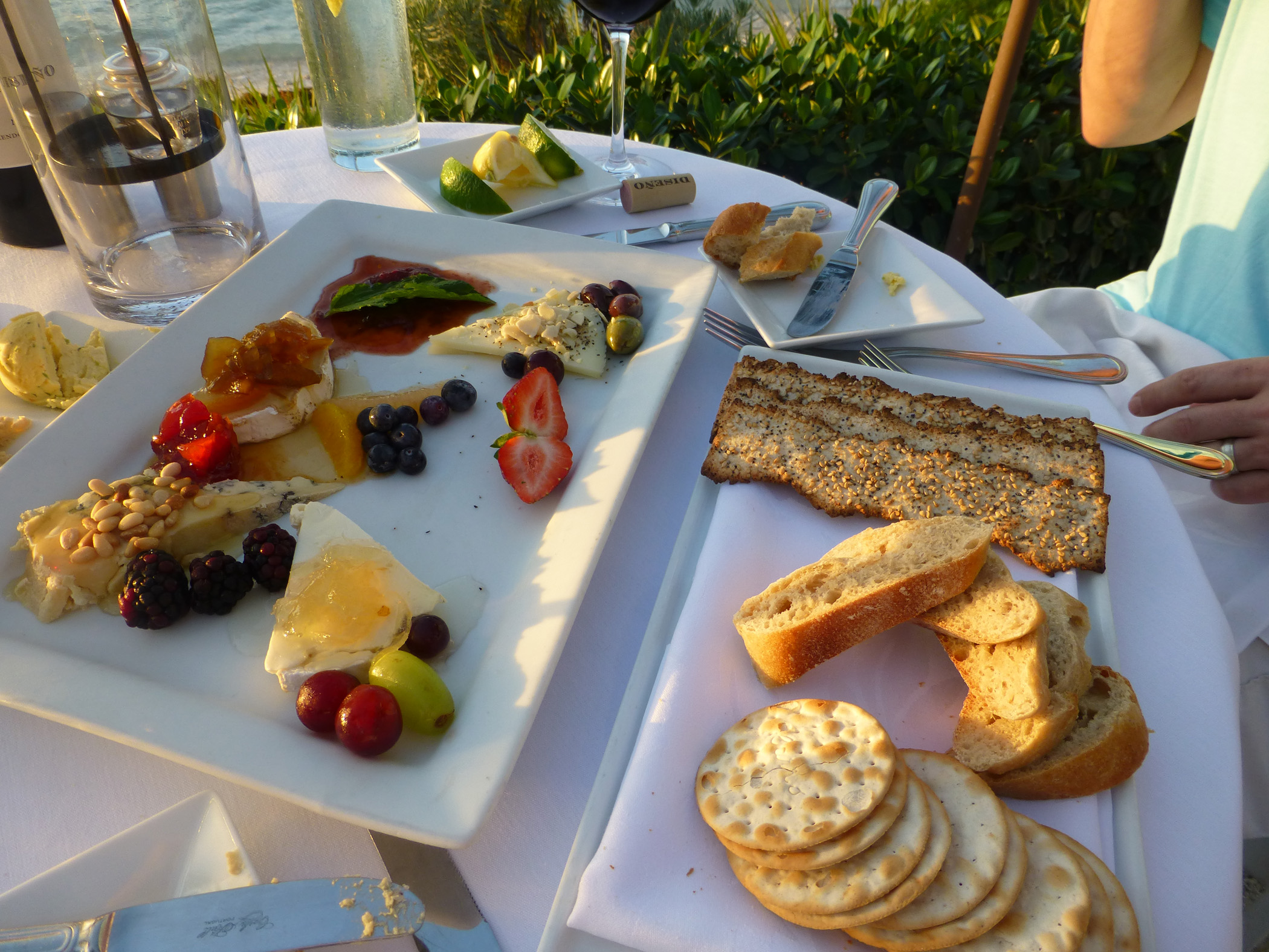 We shared a bottle of wine with a plate of assorted cheeses and crackers. It was an appetizer that was perfect to split between two people. During our first course we watched the sunset and took a few pictures to capture it. (Unfortunately no green flash – some day I will catch it!)