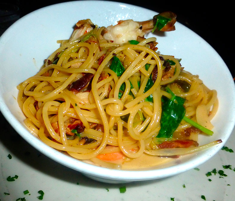 Our main courses were linguine tossed with shrimp, lobster, chanterelle mushrooms, eggplant,