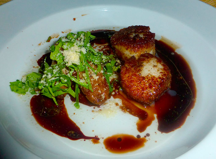 The next course was soooo good. It was pan seared day boat scallops with smashed fingerling potatoes
