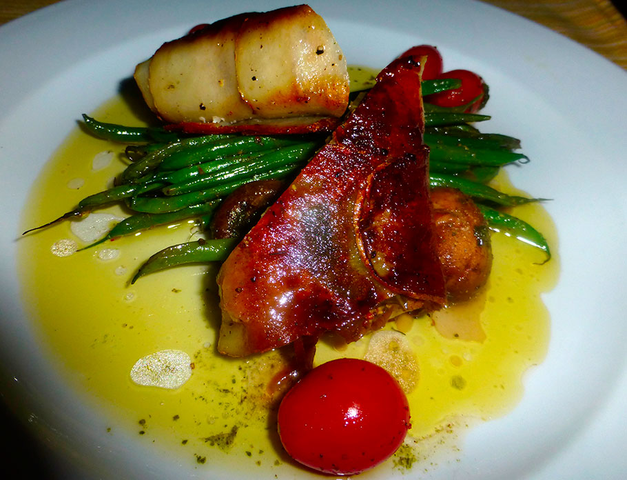 Our last course (thank goodness, because we could barely fit anymore) was potato wrapped mahi with roasted local vegetables and a lemon and extra virgin olive oil.