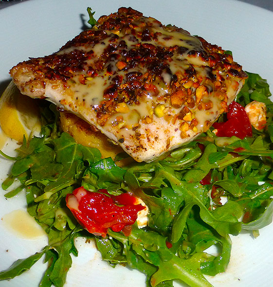 For our main courses, I had the pistachio crusted mahi mahi and my husband splurged and had the porterhouse