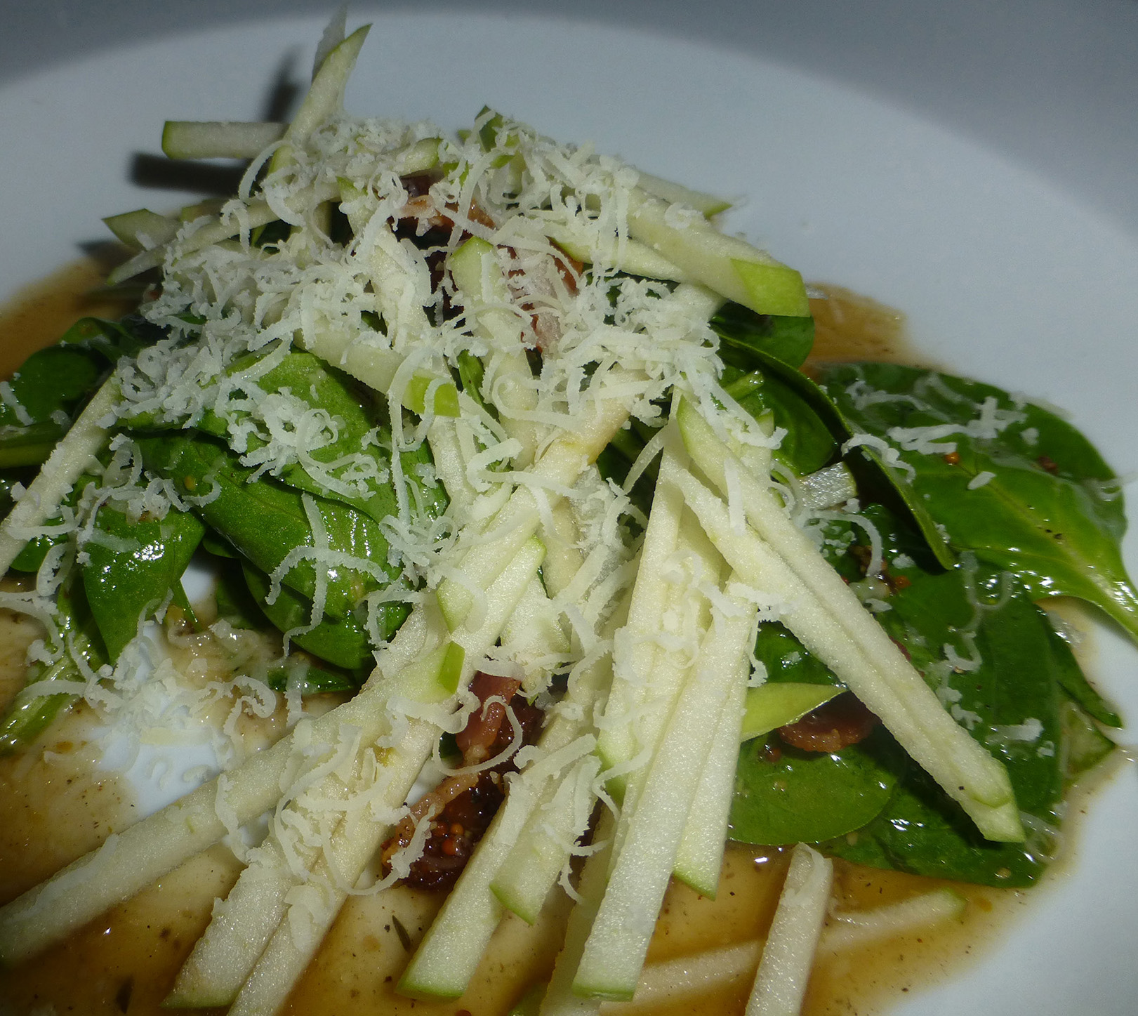 While the men had pan seared day boat scallops with smashed fingerling potatoes with truffle oil. After that, Ted brought out our salad course, which consisted of lightly wilted warm baby spinach with apple wood bacon.