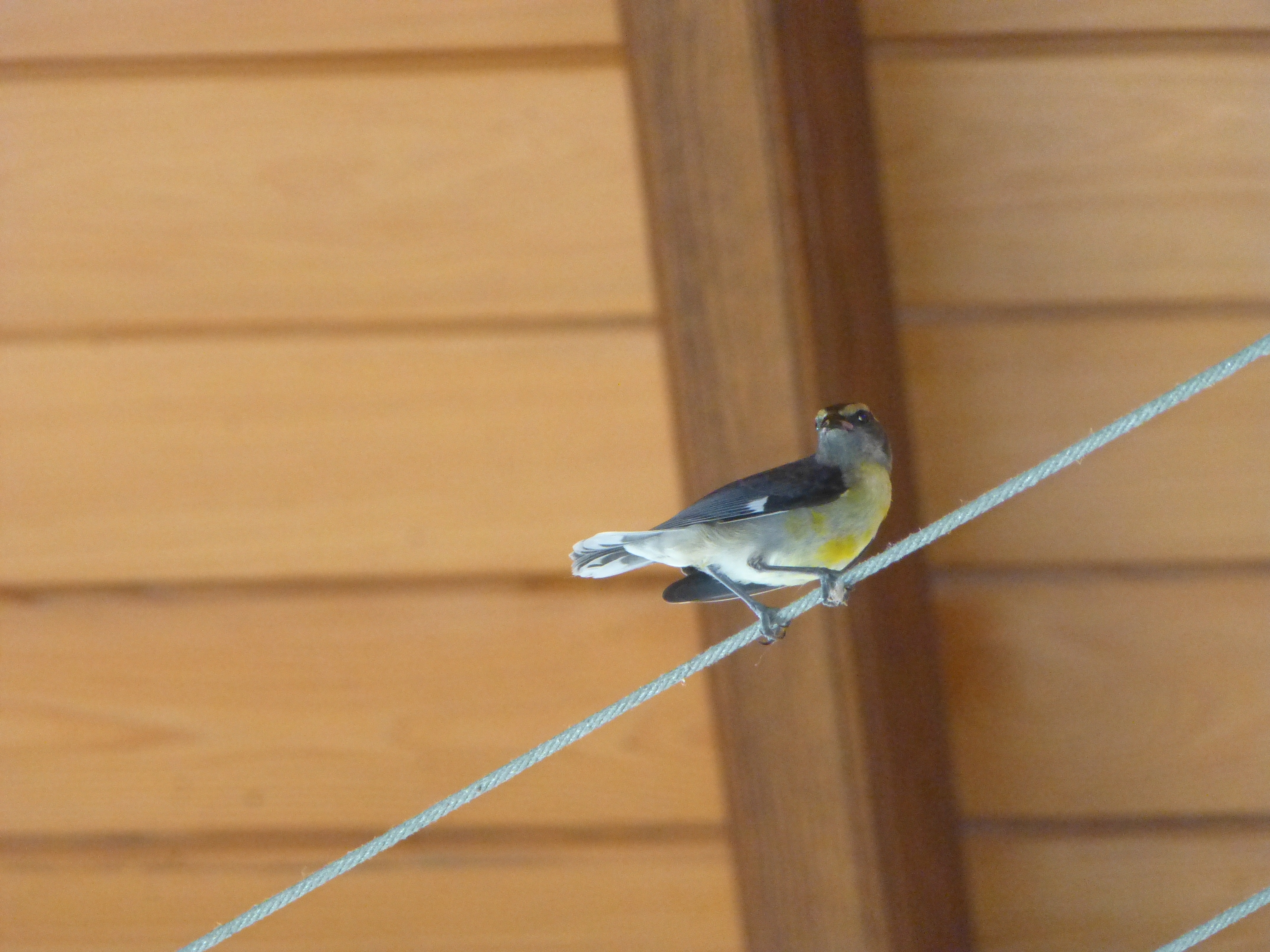 It was a banaquit. We were trying to get him out but he kept flying around too high. There wasn’t really anything for us to do. We wound up turning off the fans and AC And left a couple of doors open hoping he would find away out.