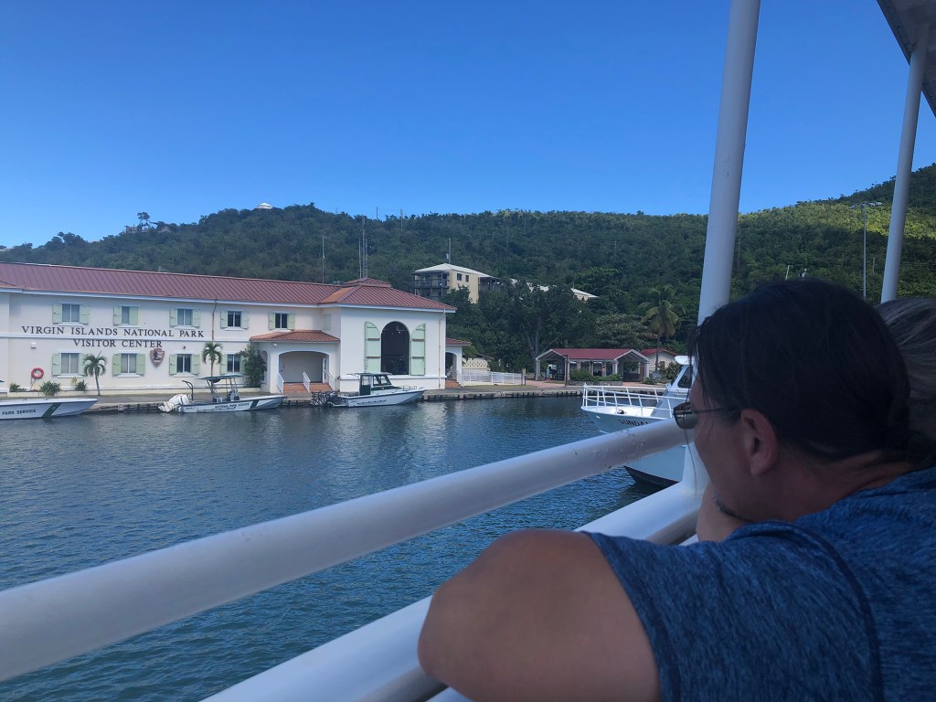 We all had carry on so we didn’t have to wait for any luggage. We exited the airport to get a taxi to Red Hook to catch the ferry to St. John. There were so many people waiting, but we were directed into a taxi that was nearly at maximum capacity, but the taxi driver insisted there was room for the 4 of us. So we wound up squeezing in the remaining spaces (barely). We had to first drop off a couple of people at the newly renovated Margaritaville Resort. It looked very well landscaped and reminded me a little of the Westin on St. John. I started talking to the couple seated behind me, and they said that they were staying at the Ritz. It was nearing 2:00pm so I figured we would most likely get the 3:00pm ferry since the next stop was the Ritz, however to my surprise the next stop was Red Hook. I couldn’t believe that we were going to make the 2:00pm ferry (which we never had before). I made sure I texted the villa manager who was meeting us at the ferry dock to let her know we would be arriving soon.