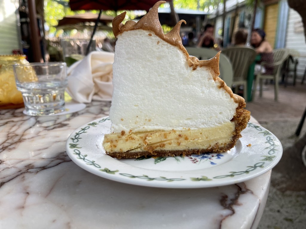 We were both full after our meals, however several years ago we saw the episode of the show with Andrew Zimmern when he visited Key West and went to Blue Heaven. I remembered him ordering a piece of key lime pie and watched behind the scenes of the baker making it – with that huge pile of meringue on top. When our server asked us if we would like anything else, I said yes a piece of key lime pie please.