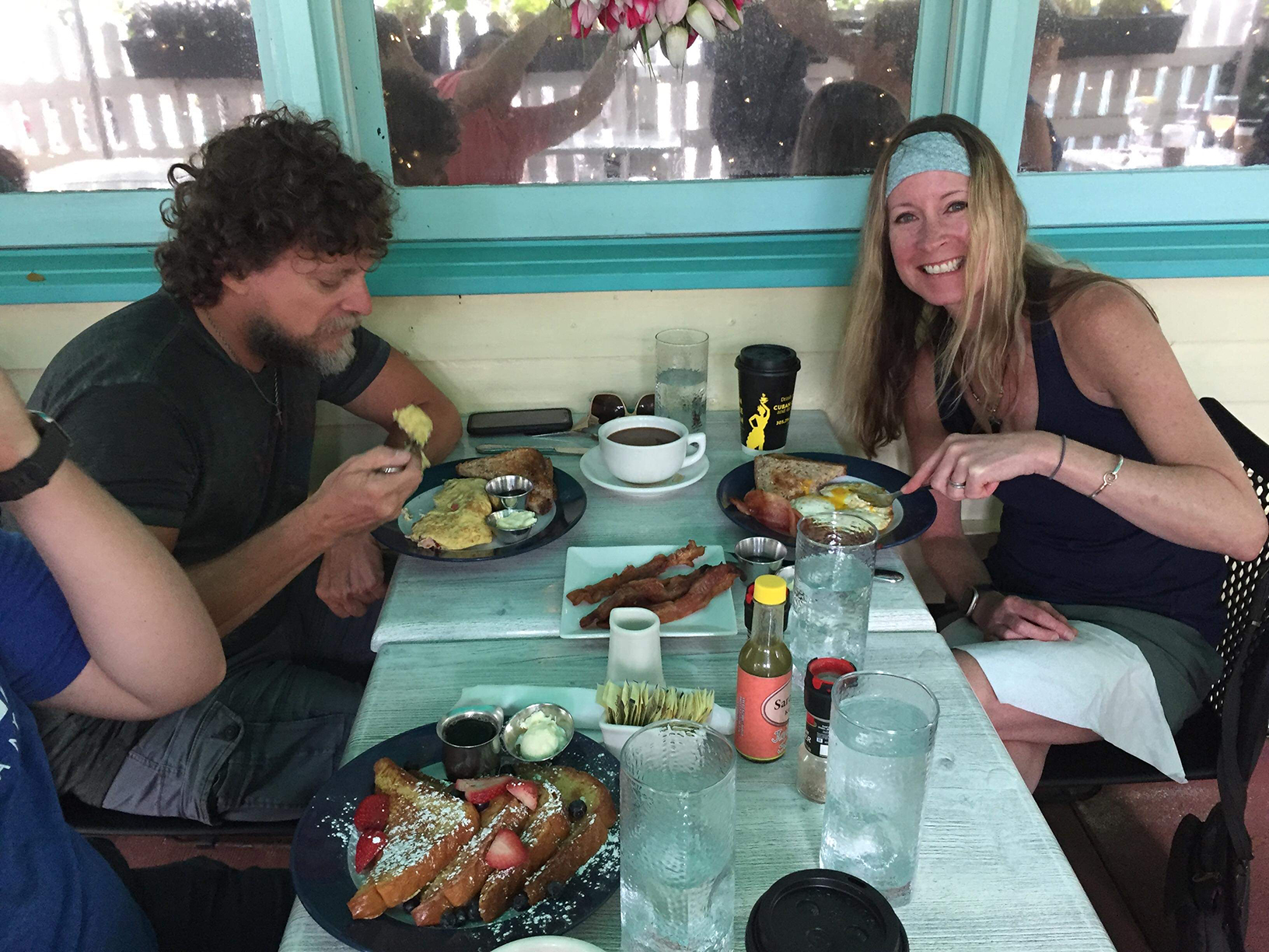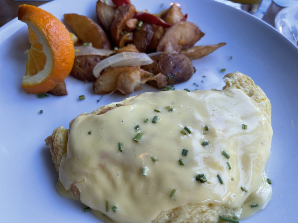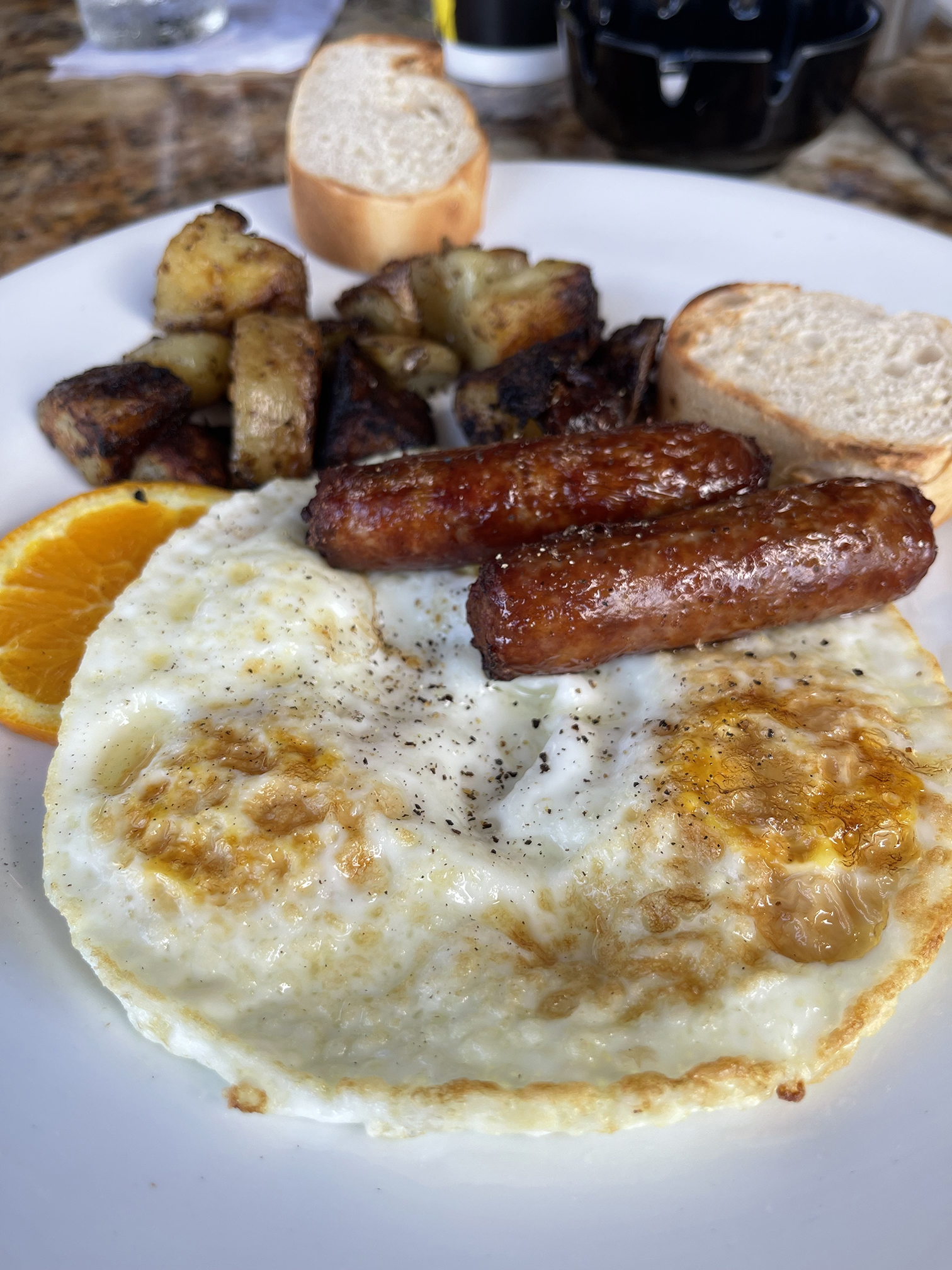 I was in the mood for something different, so I had their lobster omelette with mushrooms and swiss cheese AND topped with a Key Lime Hollandaise sauce. Yes it was decadent but oh so good. My husband ordered just a regular breakfast of fried eggs.