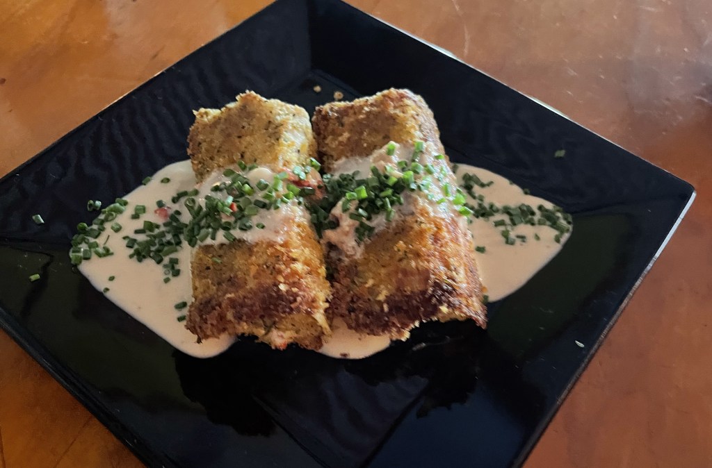 For our appetizers I decided to go with their crab cakes and my husband and had the special which were lobster crepes. When our appetizers came out they looked so good. I wasn’t sure if it was because I was so hungry but wow, the crab cakes were delicious. They were served with a light tomato sauce which isn’t a normal pairing with crab cakes but it worked beautifully. My husband absolutely loved his lobster crepes. I even had to try a taste and they too were amazing.