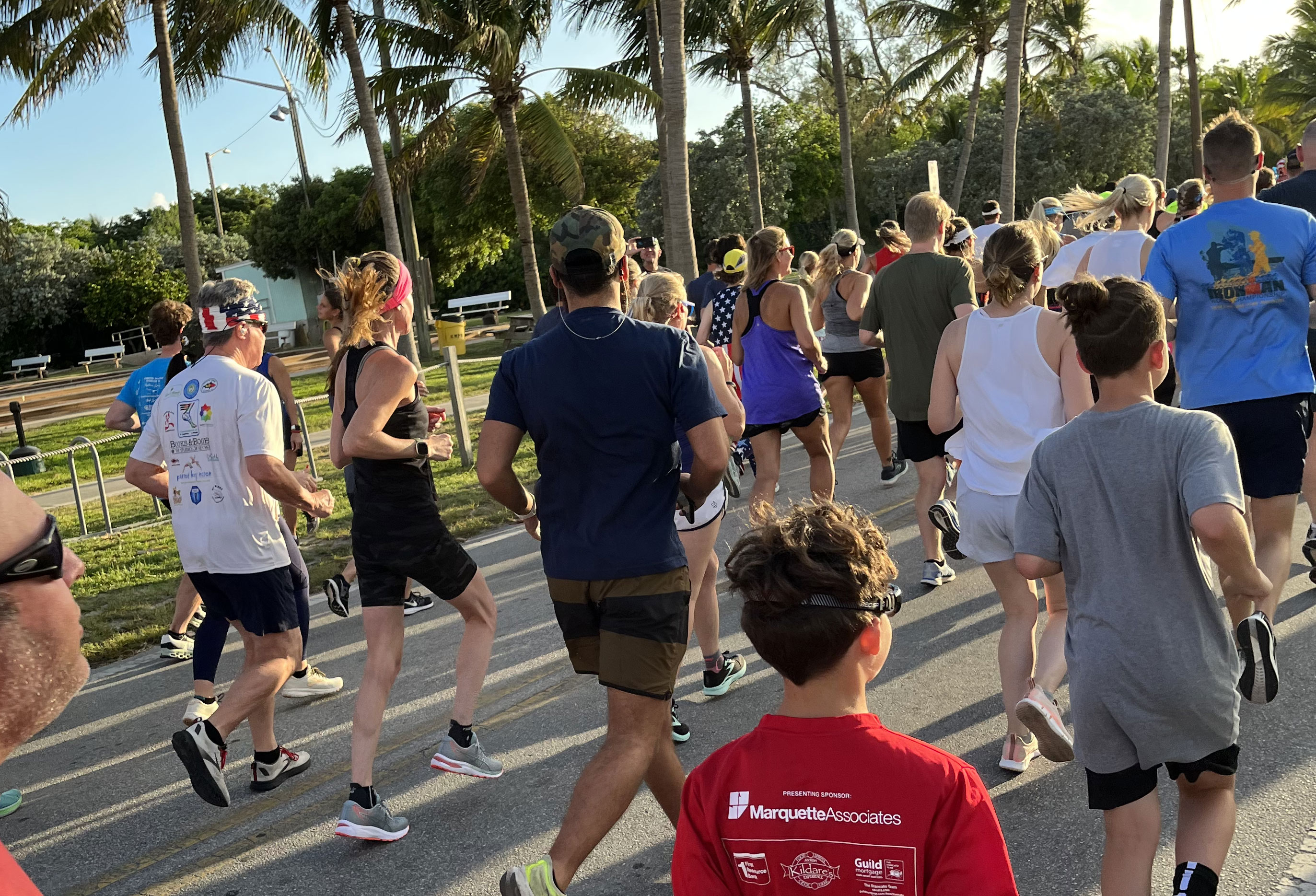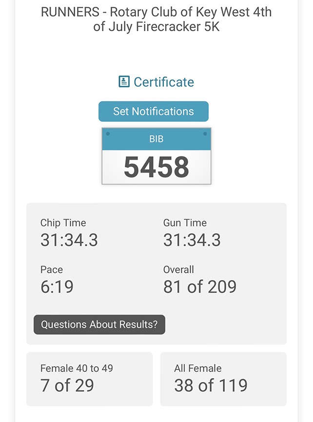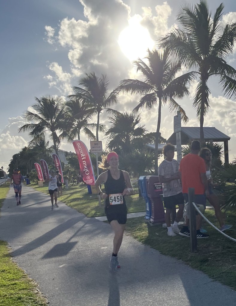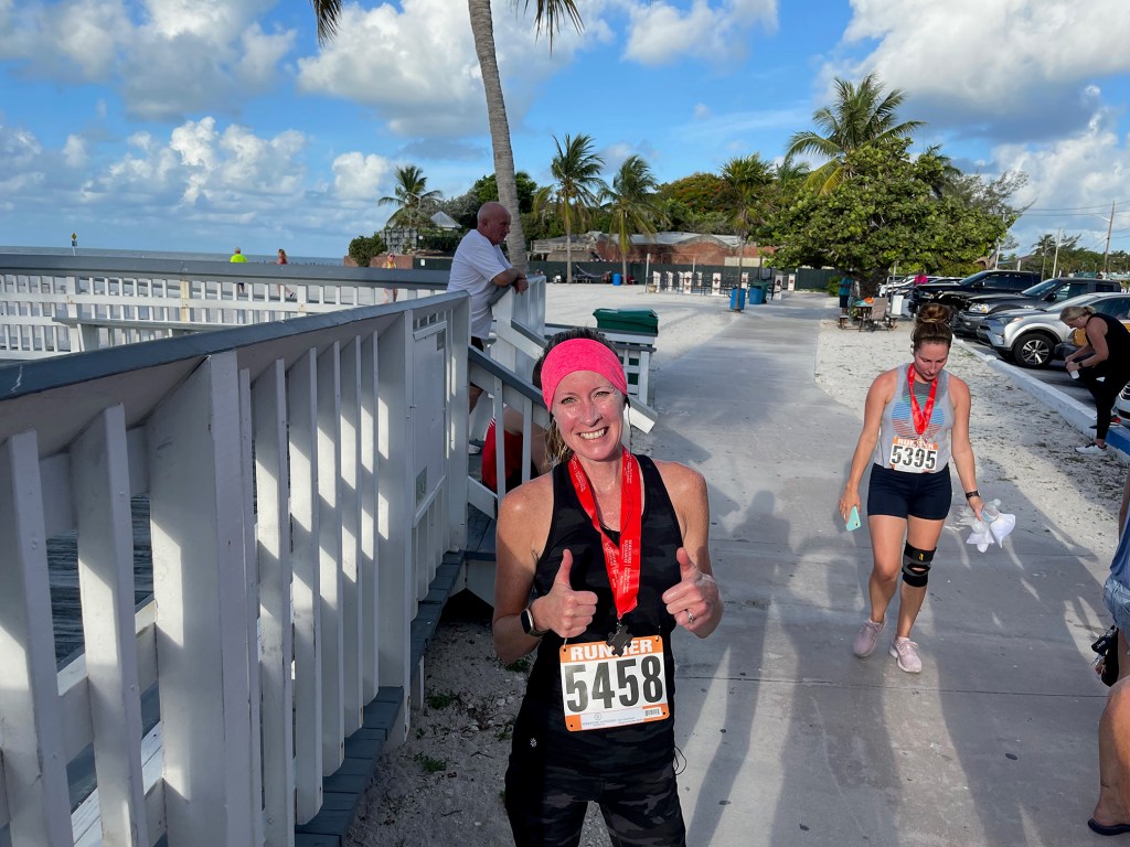 As I was running I was looking up at the palm trees and couldn’t believe I was actually doing it. We went about a mile and a half down to Smather’s Beach. Along the way, as I mentioned earlier, the smell of the sargassum was so strong. At the half way point everyone turned around and we ran back towards White Street Pier. I did have to take a couple breaths and walk a little after about 2 miles. Once I got my composure back I started running again. Finally I could see the finish line and I wasn’t about to walk again.