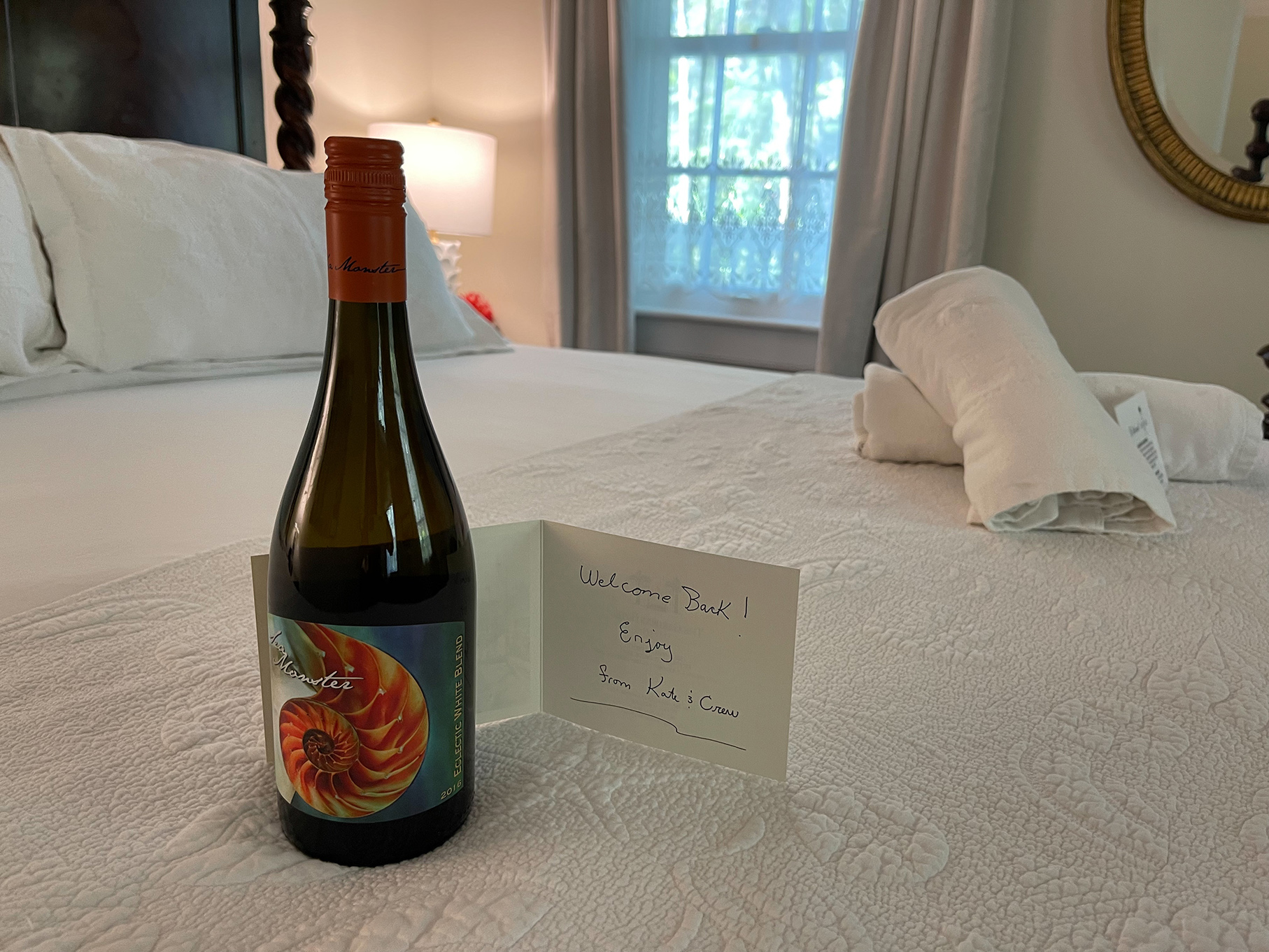As we walked through the building and out onto grounds we saw two familiar face at the pool bar. It was Brent and Julie waiting for us! Also Phil who bartends at the pool bar, whom we have become friendly with, was also working. It felt like it was a welcome wagon. We were going to drop off our things, but first Phil handed us both a cold beer. We sat down and talked to Brent and Julie for a few. While we were catching up, my husband brought up our luggage and unpacked his things. Then came my turn to do the same. When I walked into our room I noticed that Kate, the owner of the Gardens left us a bottle of wine welcoming us back. I thought it was so sweet.