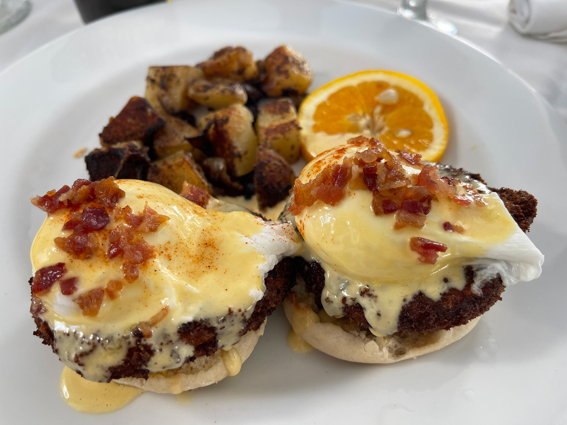 We walked down almost to the end before stopping at Bagatelle. It is one of our usual spots to have breakfast. Usually though it is in our rotation towards the end of our visit, but I was in the mood for their southern eggs benedict. We walked up the stairs and the hostess seated us at one of the tables on the front porch. I think it was the exact same table we sat in a few months ago.