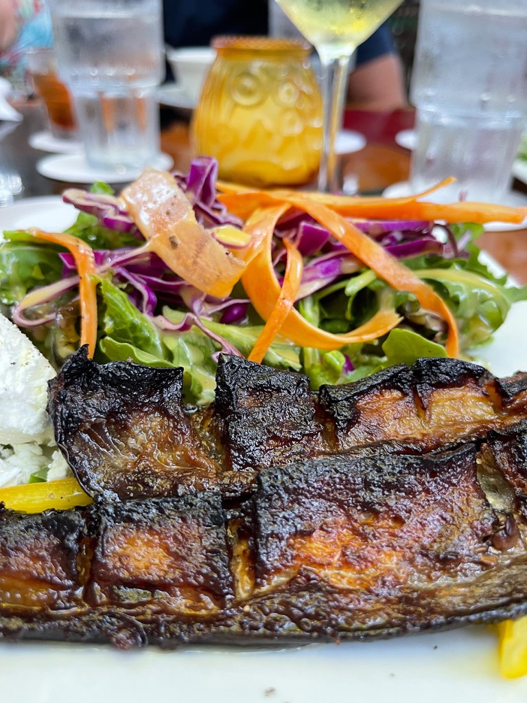 I wasn’t in the mood for seafood that night so I wound up going with the Jamaican jerk chicken. To start with, I went with the miso baked eggplant that I had been eyeing since our last time we had dinner at Blue Heaven back in July. My husband and Julie ordered the filet mignon. She told us how the filet mignon is one of the best steaks in Key West, which I was surprised to hear. You would think a place like Prime or something. Brent wound up going with the yellowtail snapper.