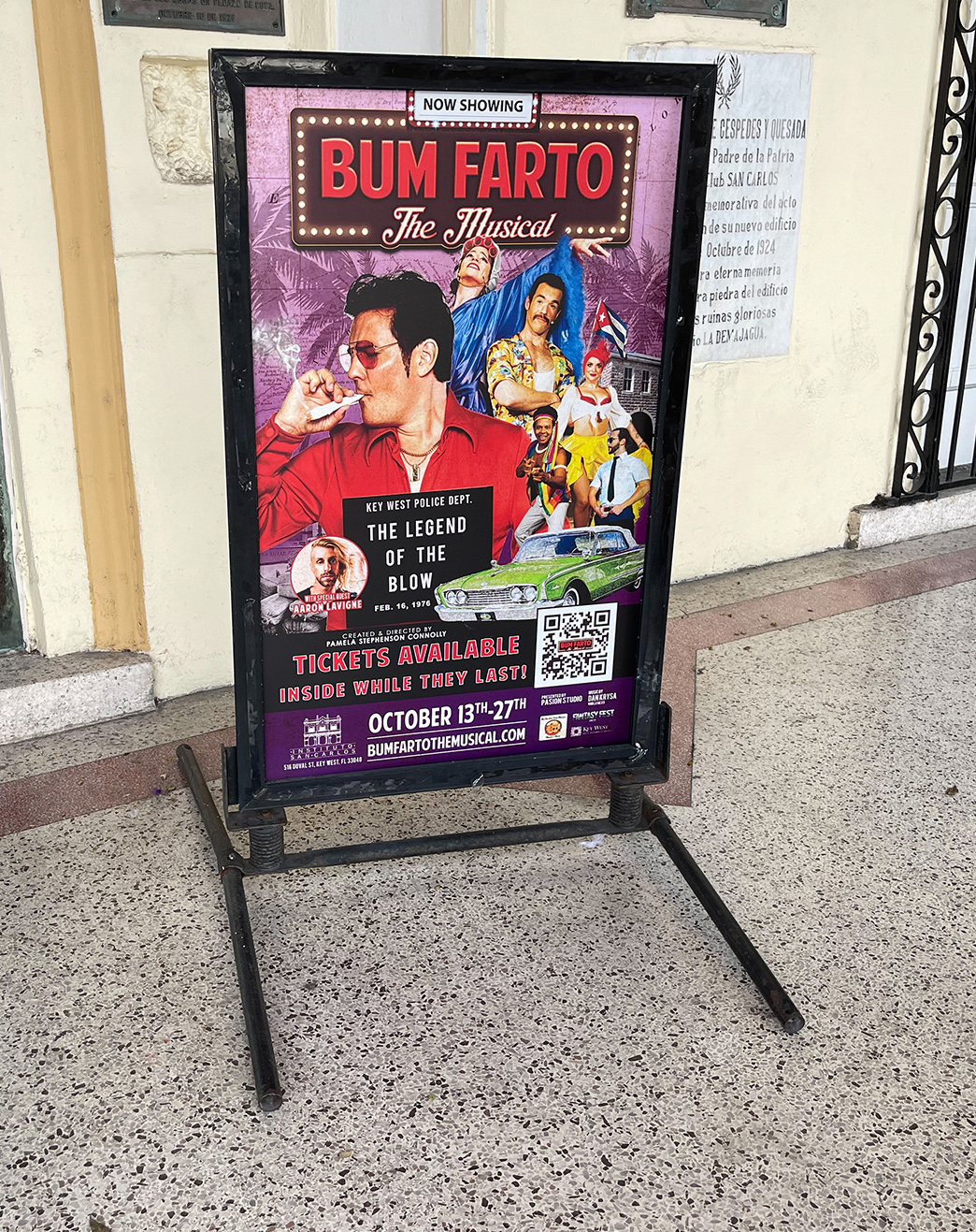 We made it to the theater and were about to go in, but all of a sudden we heard a fire alarm. Someone must have pulled it accidentally. So we had to wait for the fire department to show up. (Ironically the story of Bum Farto was that he was initially the Chief of the Key West Fire Department.)