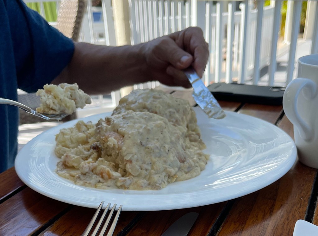 Once we were seated, our server asked us politely if we could order soon, since the breakfast service was over at 11:00am and it was almost that time. So quickly I decided to go with again, the smoked salmon and my husband ordered the sausage gravy and biscuits. The view from our table was beautiful. I thought to myself, why hadn’t we ever eaten here before? Maybe I just thought it was for guests only, but obviously it is open to all.