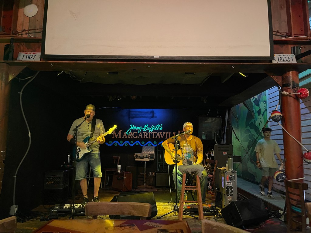 My husband paid the tab and then we walked down Front St. to Duval. Since it was a Saturday night, there were a bunch of tourists perusing the bars while we strolled towards the Gardens. As we were nearing Margaritaville, I heard music playing. I told my husband to wait but he kept walking. I popped in and noticed it was Caffeine Carl playing with another musician whom I had no idea who it was.