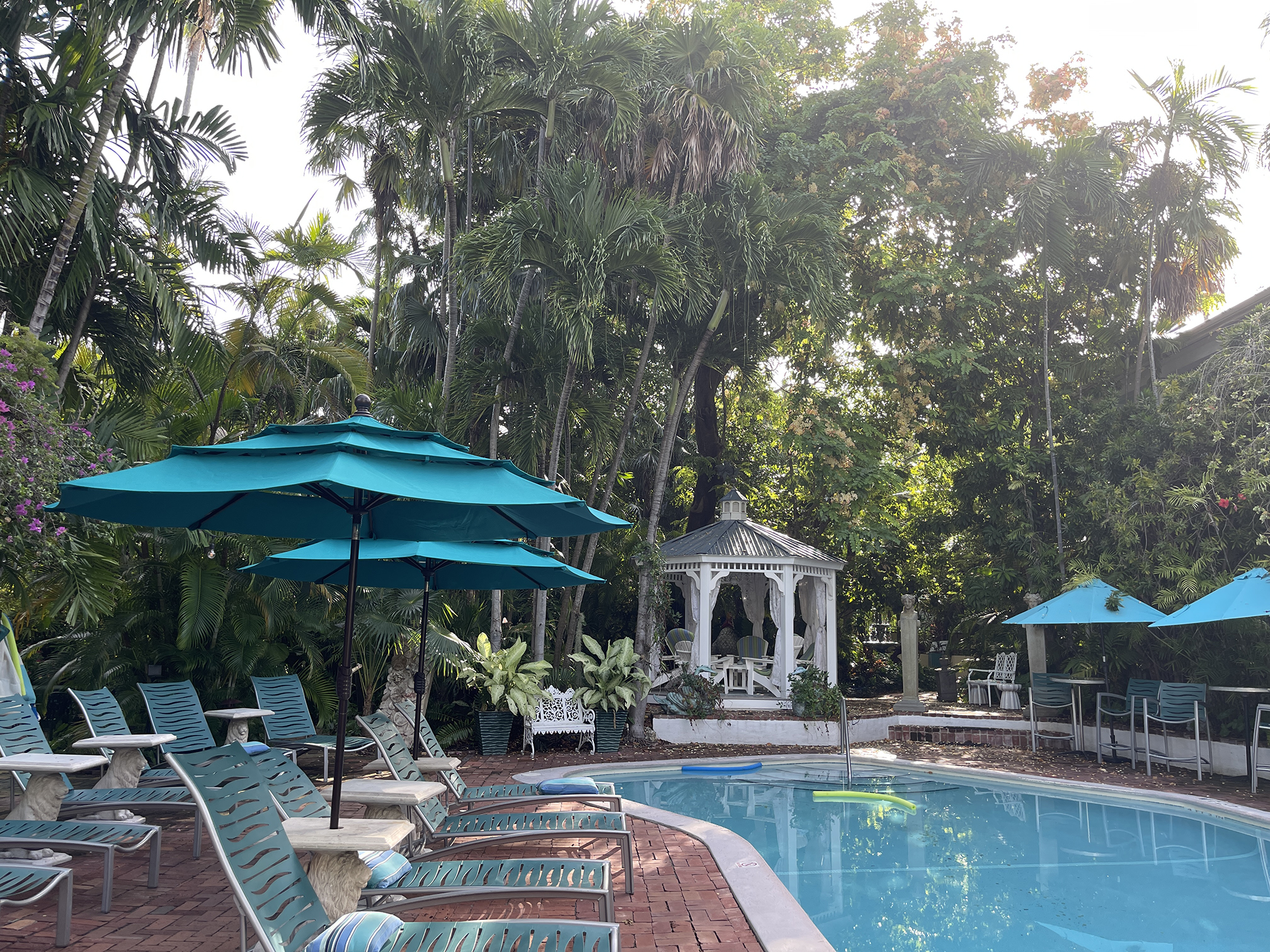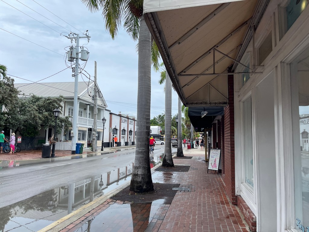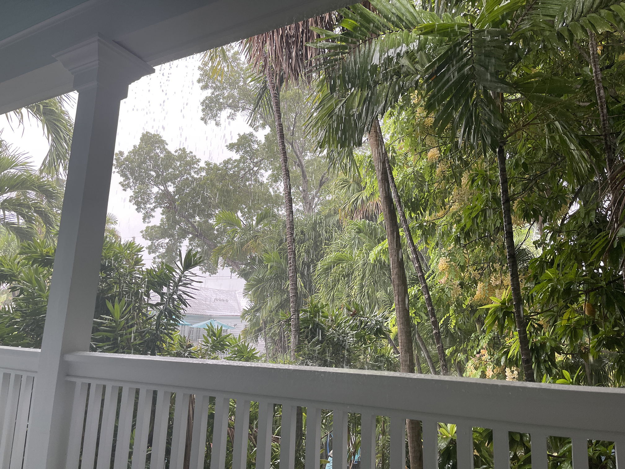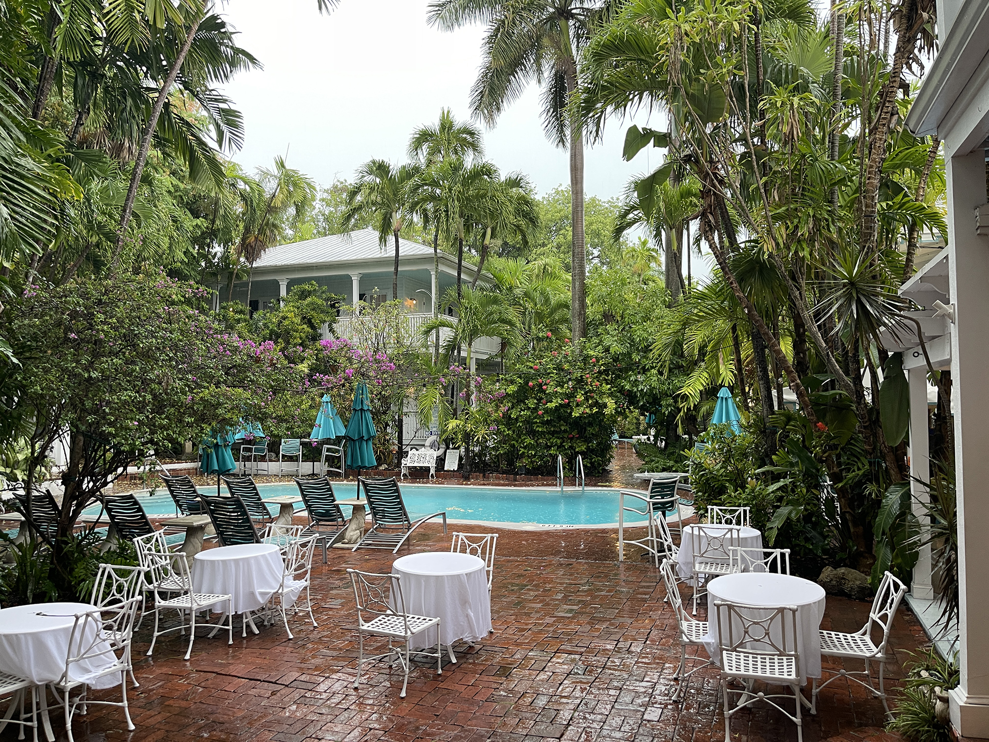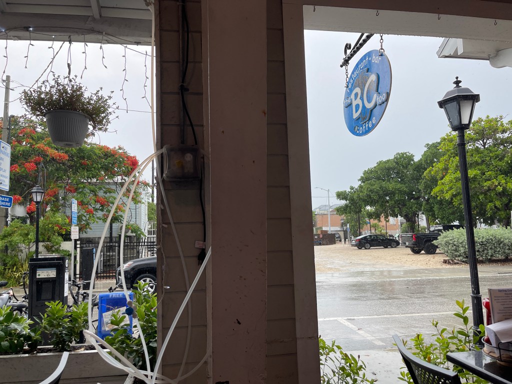 Feeling a bit down, we walked to the courtyard and saw Al and Lynn having breakfast under the porch area that was mostly covered from the rain. We sat down and told them what was going on. I grabbed a cup of coffee and we talked for a while. We weren’t sure how things were going to play out and what have you. As we waited for the rain to subside, I grabbed another cup of coffee. My husband and I weren’t really hungry so we decided to stop somewhere later to get something to eat. We came to the realization that the rain wasn’t going to stop anytime soon. Al and Lynn were supposed to go out on the water that day to the sand bar but it was postponed until the following day. Since they didn’t have any plans and my husband was in the mood for a bloody mary at the Tree Bar, we all grabbed umbrellas that are provided at the Gardens and made our way out the back to Simonton St. Again, Angela St. was completely flooded. There was no way you can walk out on the street at that point.