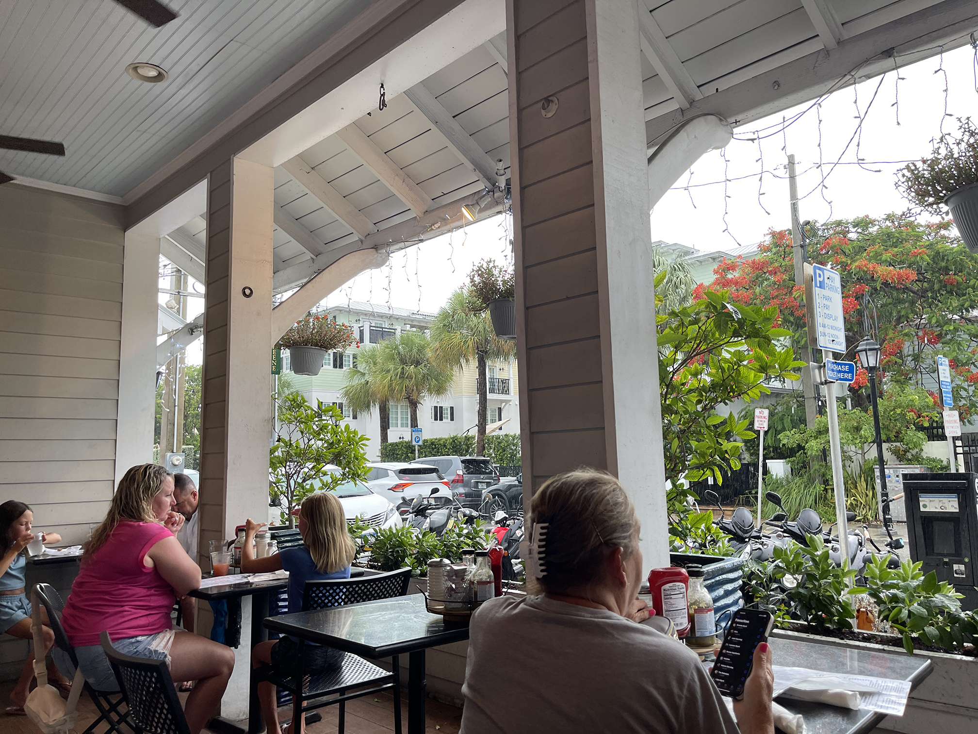 My husband and I both freshened up and walked over to Cuban Coffee Queen for our usual Cuban Americans. The rain slowed down a little so we didn’t need umbrellas. When we arrived, there wasn’t really any line formed, so we didn’t have to wait long for our order. I think the rain kept a lot of people away. We headed back to the Gardens to meet up with Brent and Julie. When we got back, Julie told us that Brent wasn’t feeling well and would pass on breakfast. Julie was still up for it so we decided on Breakfast Club Too since it is indoors. Plus the food is always solid. And then the rain started to pick back up again. It was not letting up, so I arranged for an Uber to pick us up. However, right in front of the Gardens entrance, Angela St. was completely flooded. So we had to give the Uber driver a different pickup location, Simonton St. which can be accessed leaving the Gardens hotel through the back parking lot. Luckily Simonton tends to not flood, not like Angela.