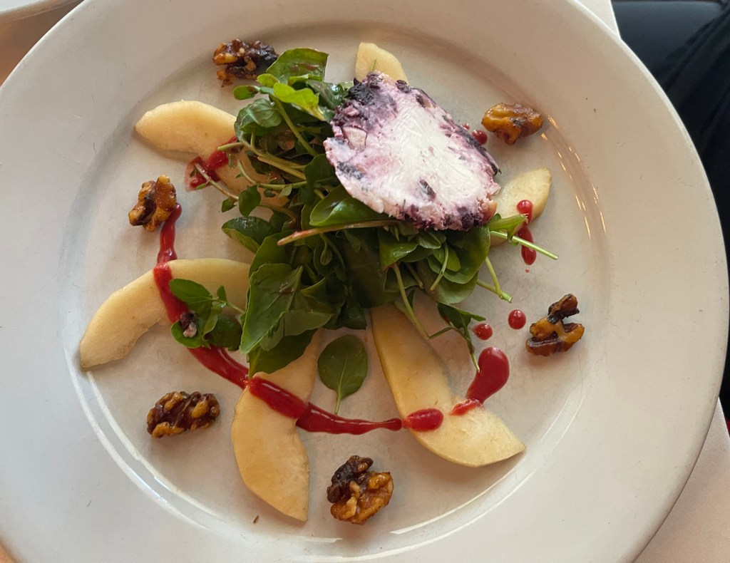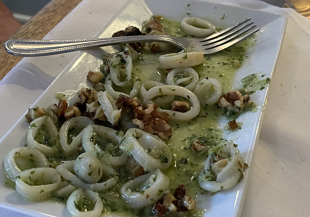 To start I chose the escargot while my husband went with the sautéed calamari. My husband ordered the wagyu beef burger and I decided to go with nicoise salad with grilled yellowfin tuna. While we waited, our glasses of wine arrived. The wine was very good. It wound up being the perfect pairing with the escargot. I love their escargot there with all that garlic. I don’t think you can never have too much garlic. The sautéed calamari my husband ordered was just as good and perfectly cooked. Sometimes calamari can become a bit rubbery. Not this calamari. It was very tender to eat.