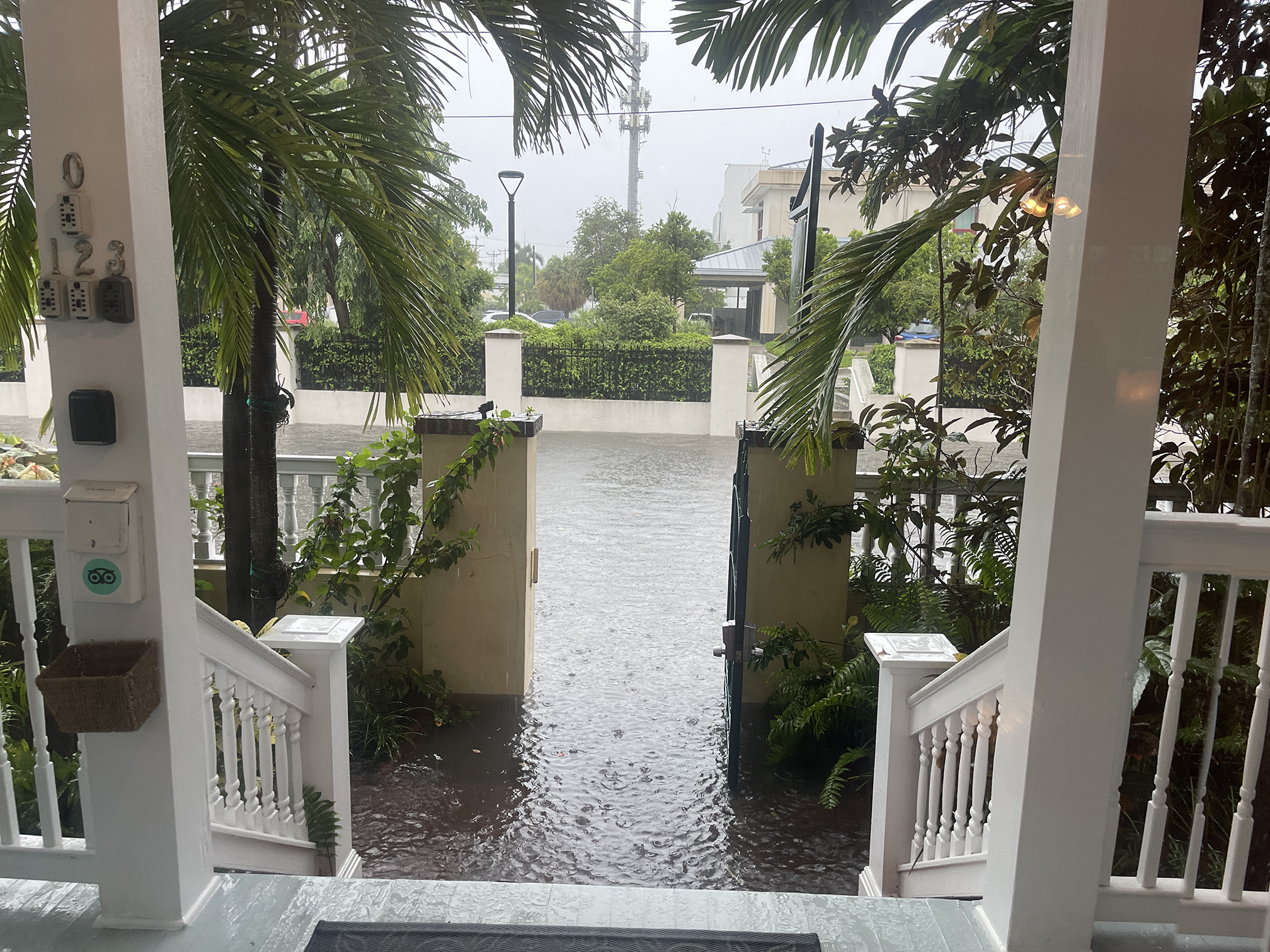 Everyone was enjoying their drinks, but we kept worrying about Julie and Brent. So after we were done with our drinks, we walked down Duval back to the Gardens to check on Julie. The rain had ended, but the streets were still soaked. Luckily the water on Angela retreated so we were able to get back through the main entrance of the Gardens.