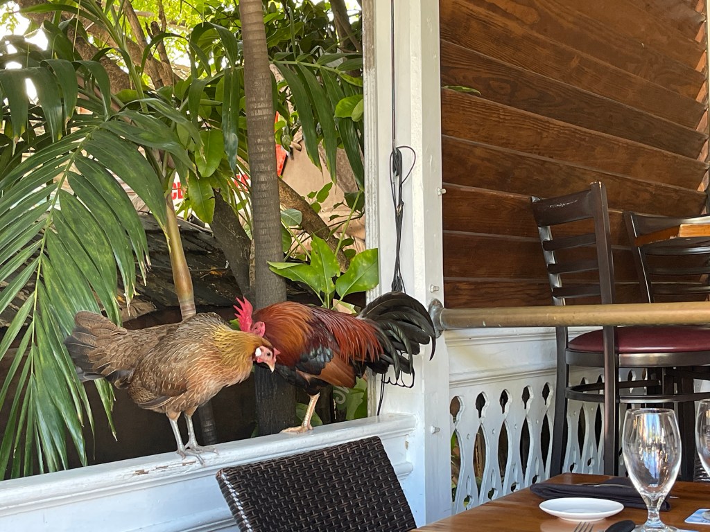 While we were waiting for our breakfast to be served, we couldn’t help but notice a rooster and chicken on the railing. When the table next to us was served their food, they flew right down and started to look for anything that fell on to the ground. It was like they knew that was the spot to try and get some food. (They were waiting all along.) I would assume they probably hang out there all the time and have become quite good at it. They even flew up onto the railing by the table and tried to get a breakfast potato. Eventually they were swooshed away so that the family could finish their meals in peace.