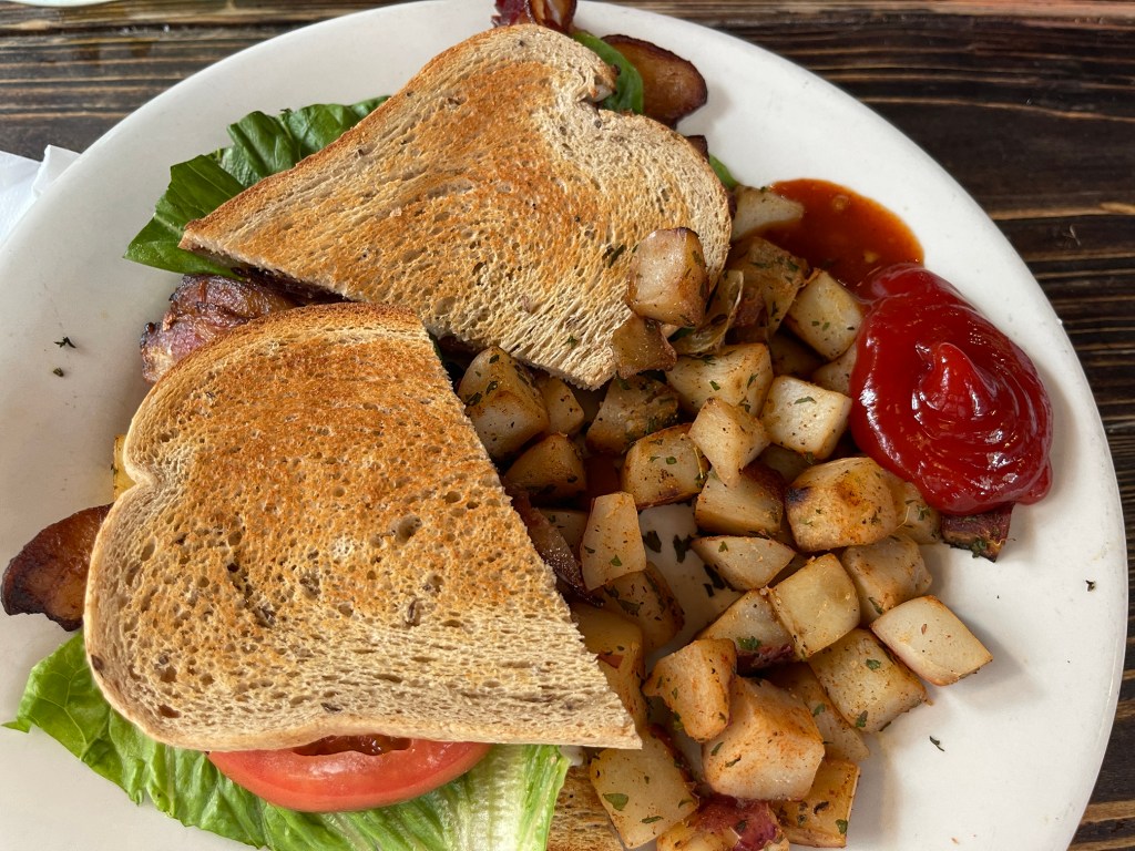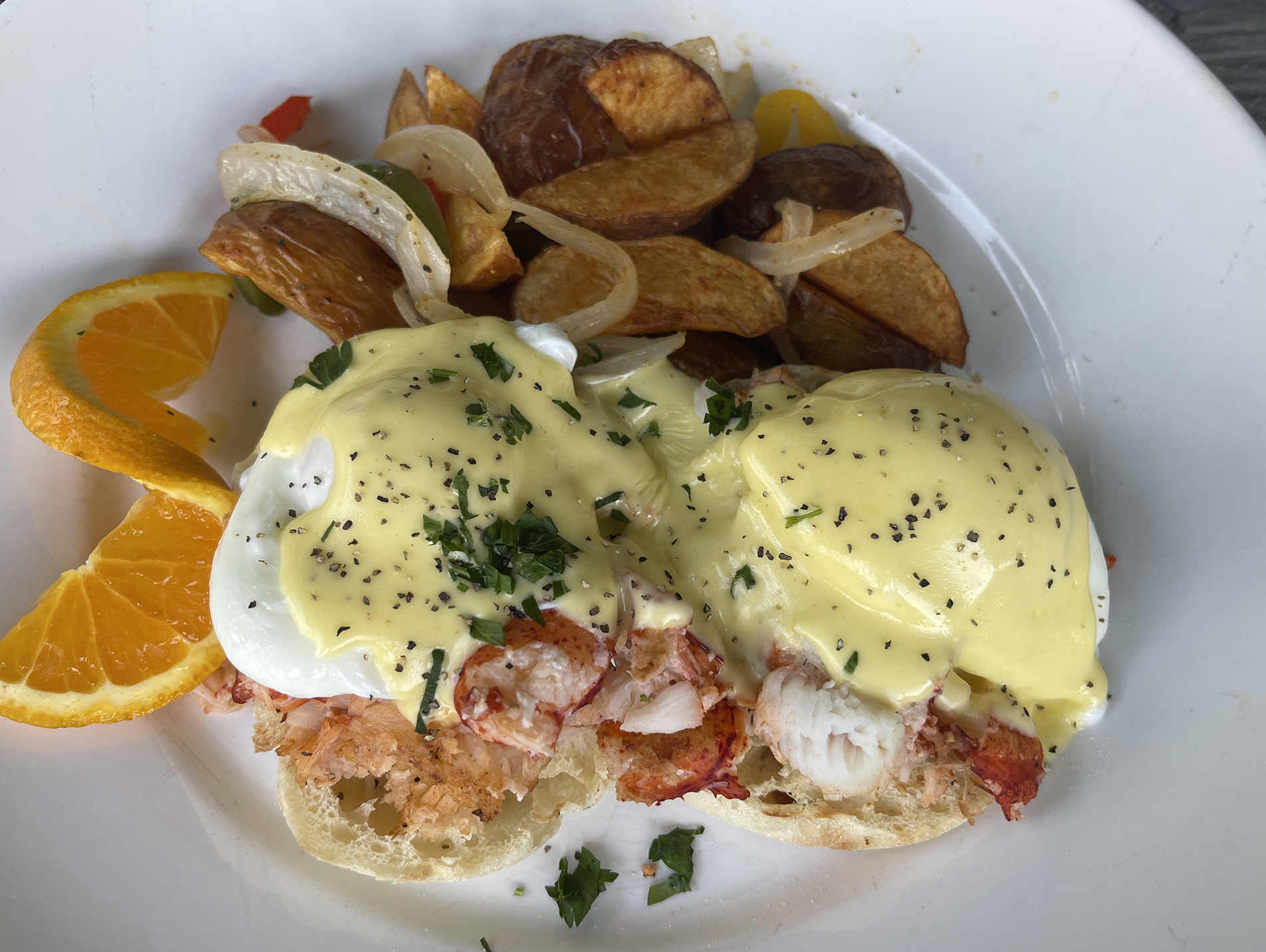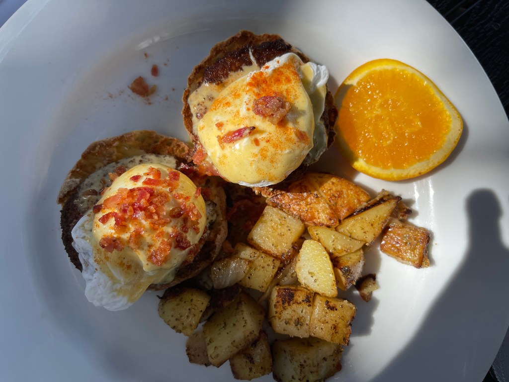 We made it to Bagatelle and like most places this time of year, it was fairly quiet. I told the hostess that we were now a party of two. I had the porch on the second level reserved, but I saw a nice table available right on the first level. We sat down and looked over the menu. I had no idea what to have. The lobster omelet seemed intriguing and I was thinking about ordering that. I have had it before, but it has been a while. When our server came over, she told us that they were out of Maine lobster and they were substituting it with Caribbean lobster. All well. My husband decided to go with the biscuits and gravy and I pivoted to a couple of fried eggs with bacon and toast.