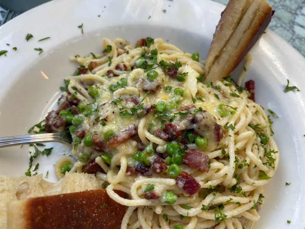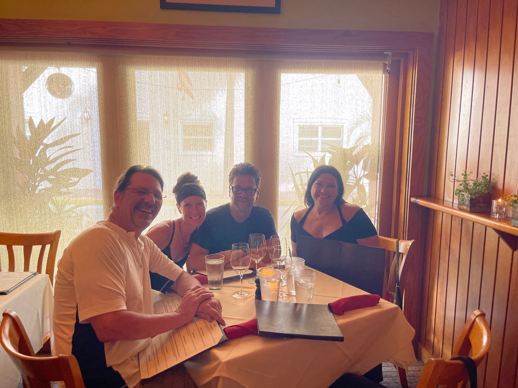 To start, I ordered the escargot and decided to go with the carbonara for my pasta of choice. Both Al and my husband ordered a similar vegetarian pasta dish, while Lynn ordered the mahi mahi with a side of pasta. The boys wound up sharing a bottle of red, while the girls shared a bottle of white. While we were waiting for our first course, Julie reached out to us. She had made it back to the Gardens with Brent. We couldn’t believe that she made it back and it was around 7:40 in the evening. Everyone was so happy to hear that they were back.