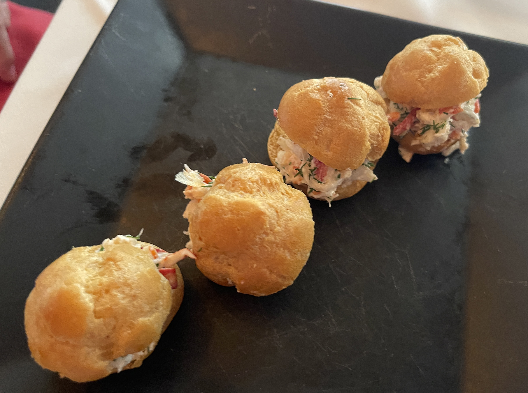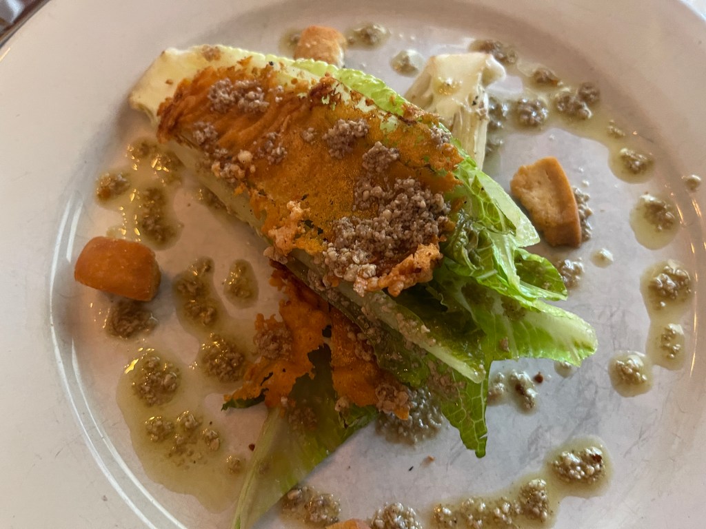 When our server came back with our drink order, I ordered the grilled caesar salad to start and the stuffed poblano pepper. My husband ordered the lobster profiteroles, while Brent and Julie ordered the caprese salad and the pear and blueberry salad. Julie also ordered the deviled eggs with scallops for us to share. I think for their main courses, Brent went with the fish special and Julie went with the scallops.