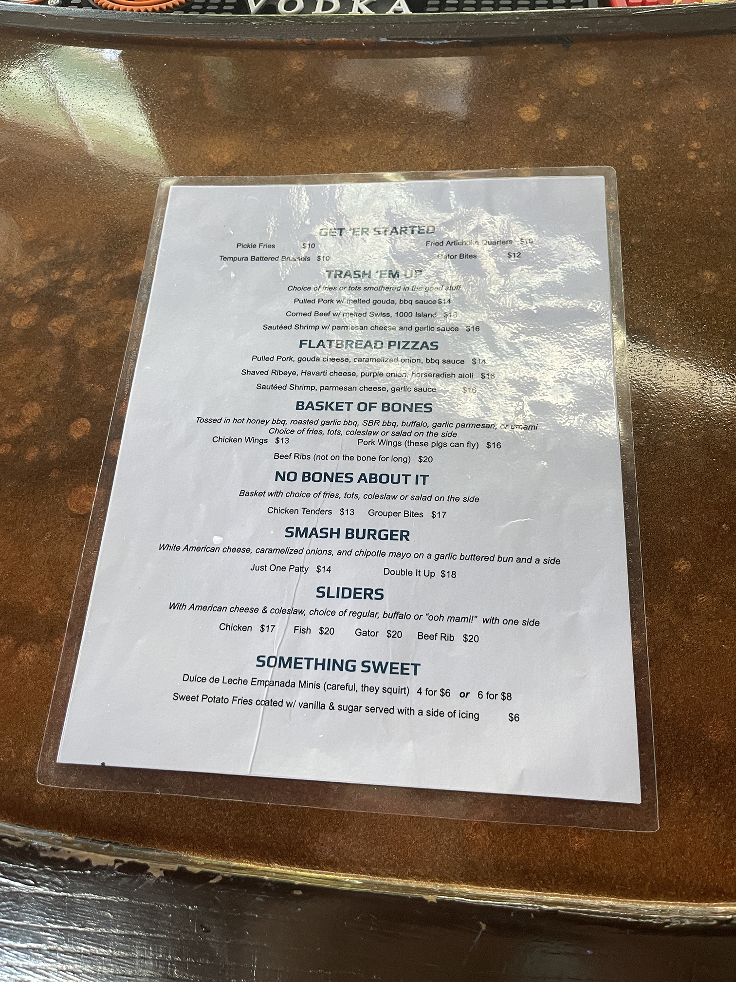 The bartender welcomed us in as we sat down and looked over the drink menu. We both got a kick out of the names of the cocktails. Even the food menu was interesting, including gator bites.