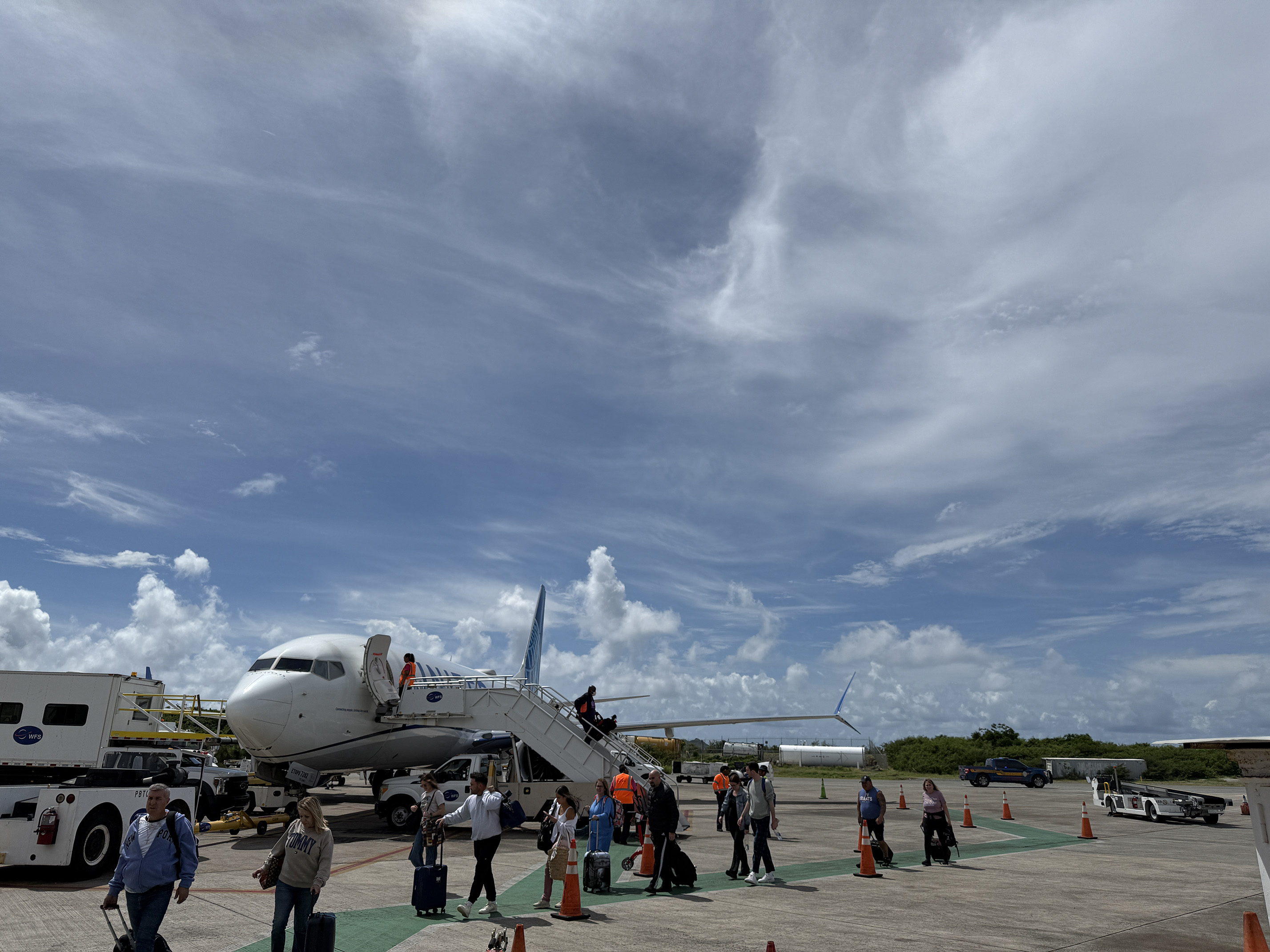 We taxied to the arrival gate and grabbed our things. I always love walking out onto the stairs and feel the air of the islands. The sun was shining and I could feel it beating down on us. We quickly walked down the stairs and waited for our friends who were seated towards the back of the plane. While we were waiting for them, I checked my phone and saw a message from our on-site villa manager. He said in his text that they had the same day turnover and the earliest we could check in would be 3pm and that he would leave the keys on the kitchen island. After his message there was a pin drop for the villa location. Really? I couldn’t believe that first, he wasn’t going to be there when we arrived at the villa and second, we had to find it for ourselves. Thankfully I had a pretty good idea where Leeward was located. Several years ago we stayed at Caribbean Palm Villa in Point Rendezvous and I remember passing the Leeward Villa Sign.