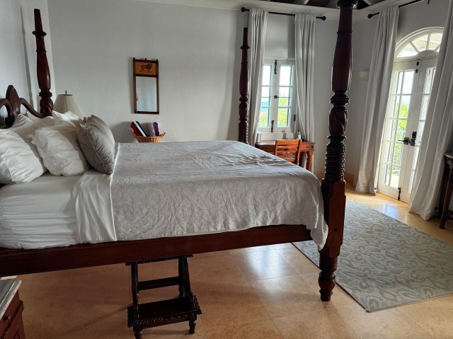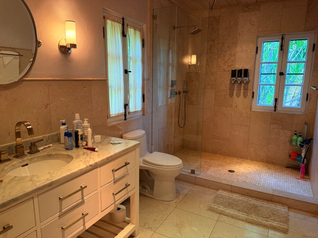 Leeward has four equal bedrooms all with king beds. Two bedrooms are located on the main level while the other two are on the lower level, all inside (no outside entrance). I found the mattress very comfortable in the master suite, but the bed itself sits up quite high. There was even a step stool to get into the bed (on my husband’s side – I had to jump in on my side). AC is throughout the villa which feels wonderful after a day outside whether visiting one of St. John’s infamous beaches or taking a dip in the lovely infinity edge pool. The AC in the bedroom overall was very cold at night and we could not figure out how to change the thermostat even after replacing the batteries.