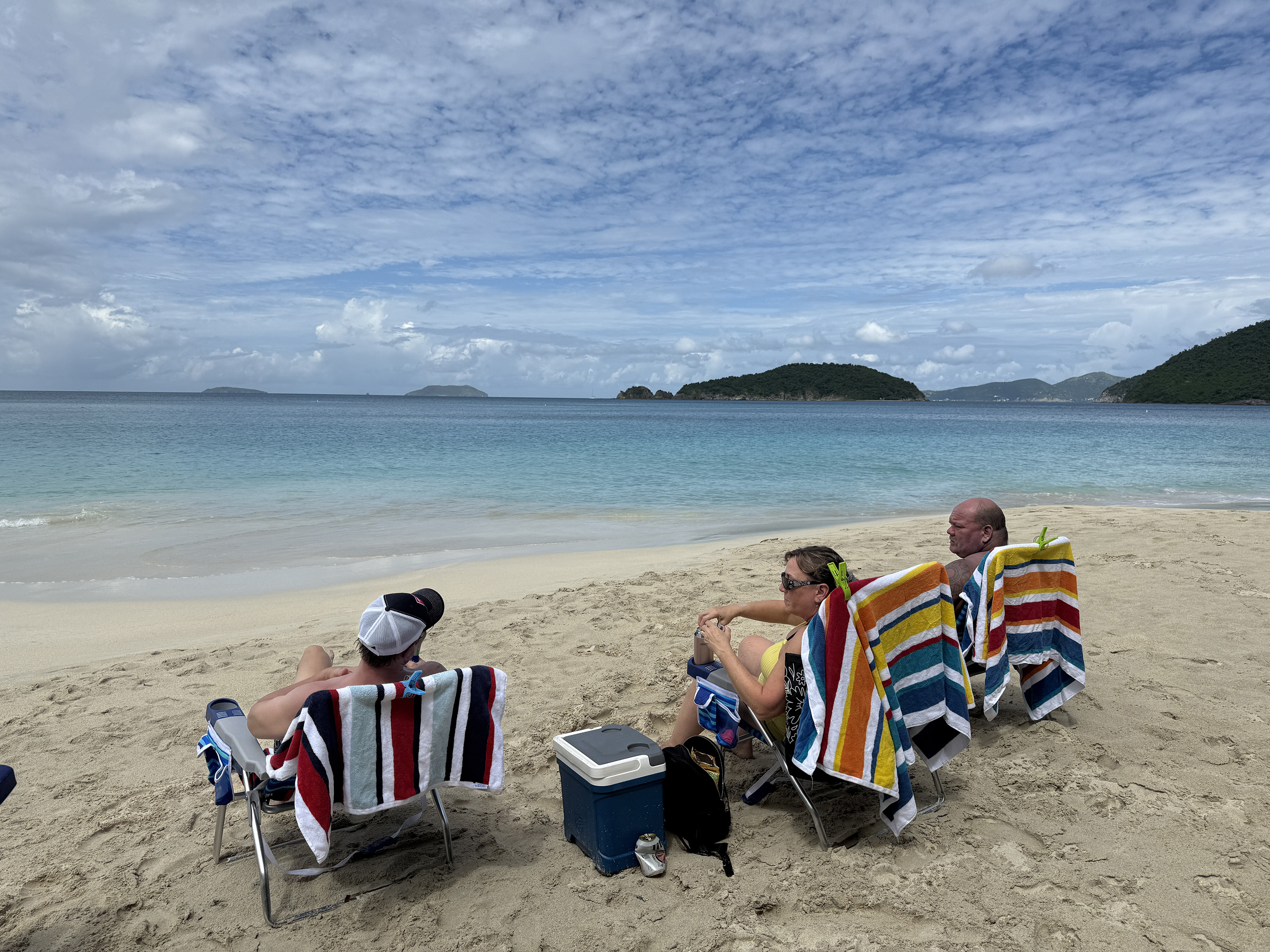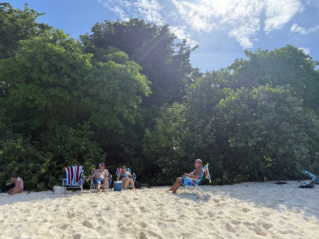 We set up our chairs and the guys immediately went in to the water. I stuck my feet in and went a little further in – maybe to my waist, but as I was about to put my head under the water I turned and looked up. There was a very dark cloud about to move right over us. I thought I better wait until it passes – just in case. Well I am glad I did, because within minutes the rain started. I was more concerned about our bags with our phones rather then getting wet. So Dawn and I grabbed the chairs and moved them up a bit on the beach and under a few sea grape trees.