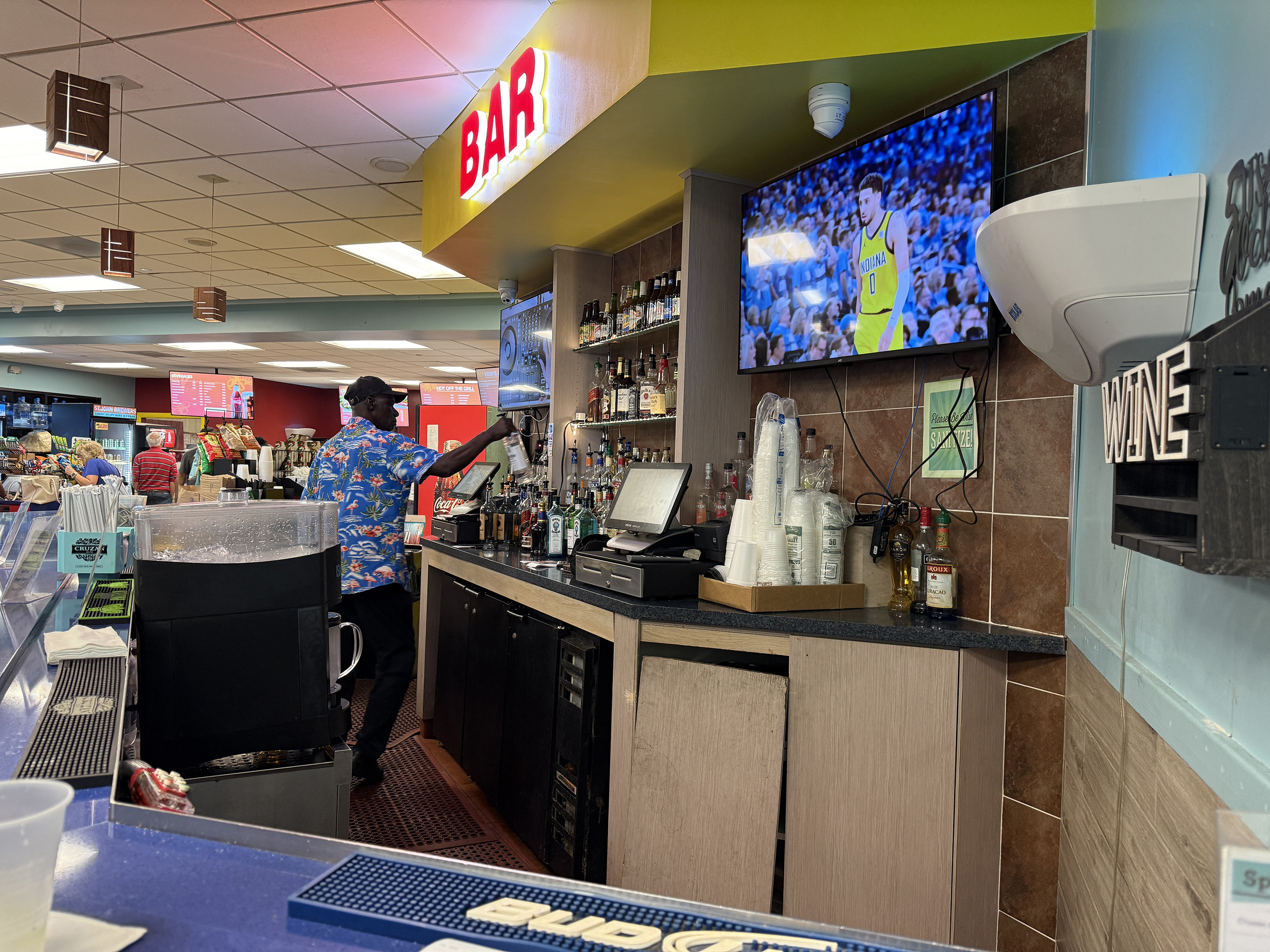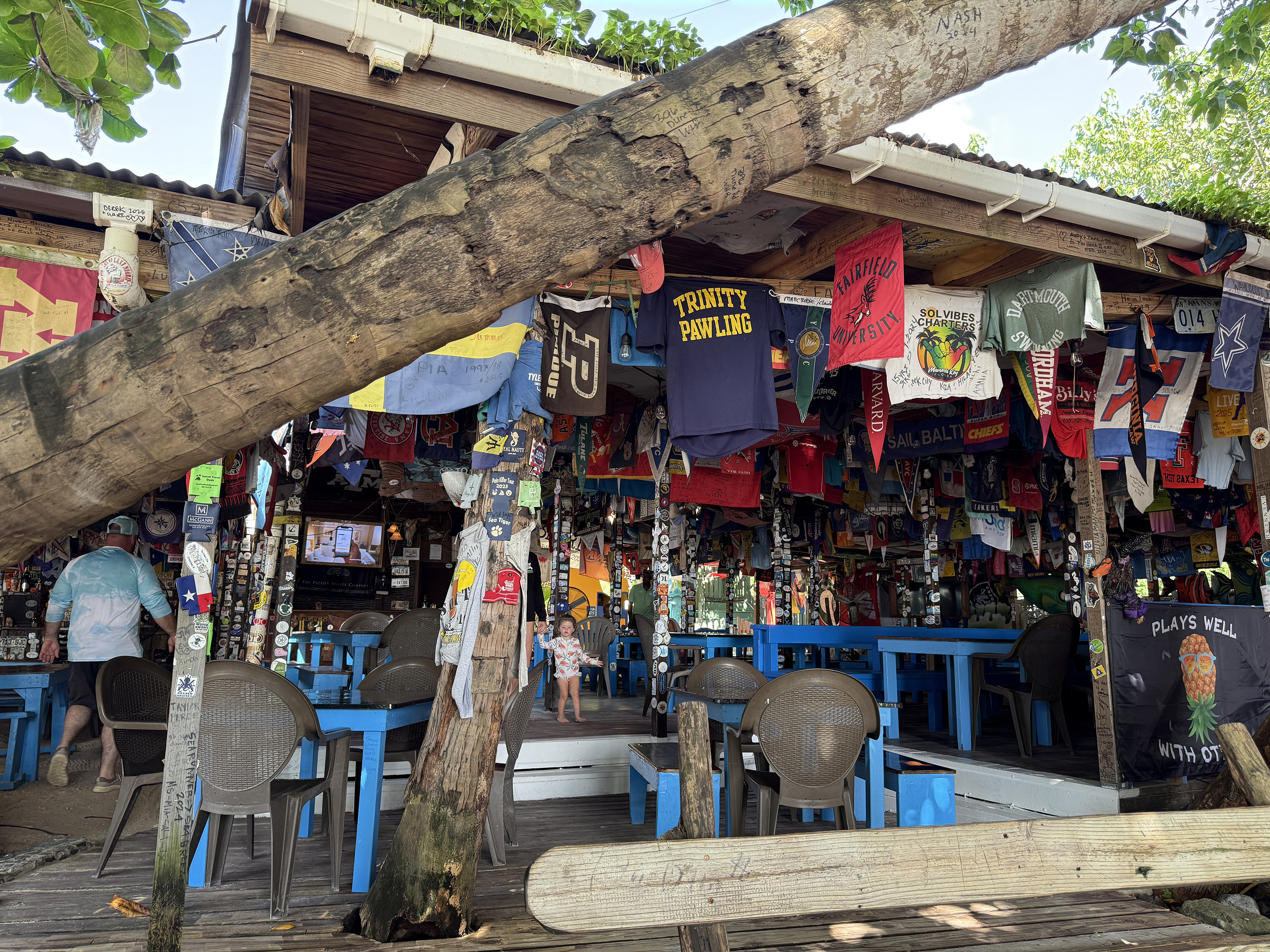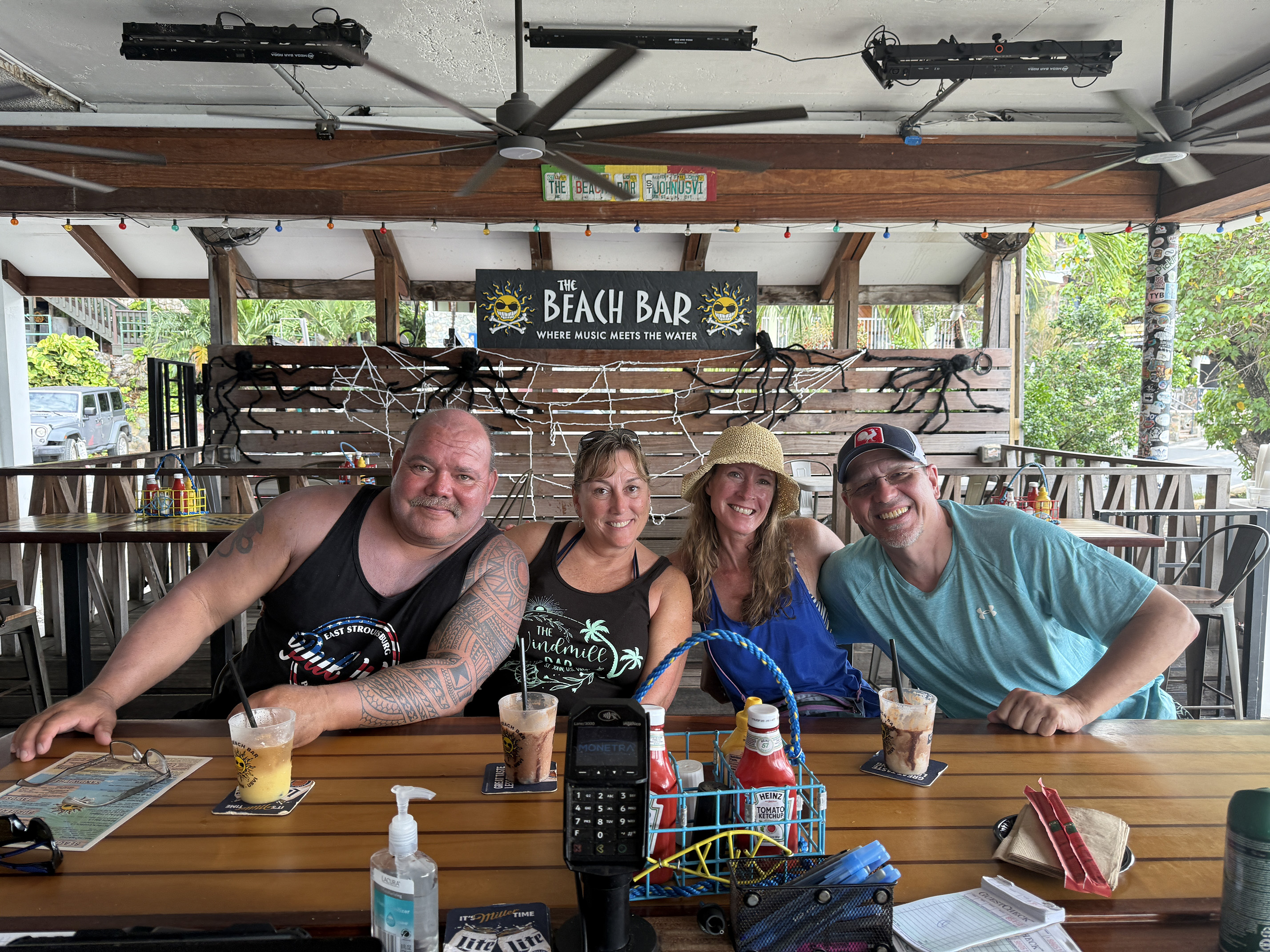 My husband navigated the switchback turns back down through the national park. We made it back to Cruz Bay and the skies appeared to be brighter. I was craving a bushwhacker at the Beach Bar, so I suggested that maybe we could stop by there for lunch. So my husband parked the jeep at Slim Man’s. It was just after 1pm so it wasn’t full yet. When we walked through the Wharfside I could see the somewhat new Karma restaurant. I couldn’t believe how much it had taken over the area and spilling onto the beach. In order to get to the Beach bar, we had to walk through it. While the decor did look beautiful, to me the vibe didn’t go with St. John. It seemed out of place, but there were several people dining and enjoying their meals.
