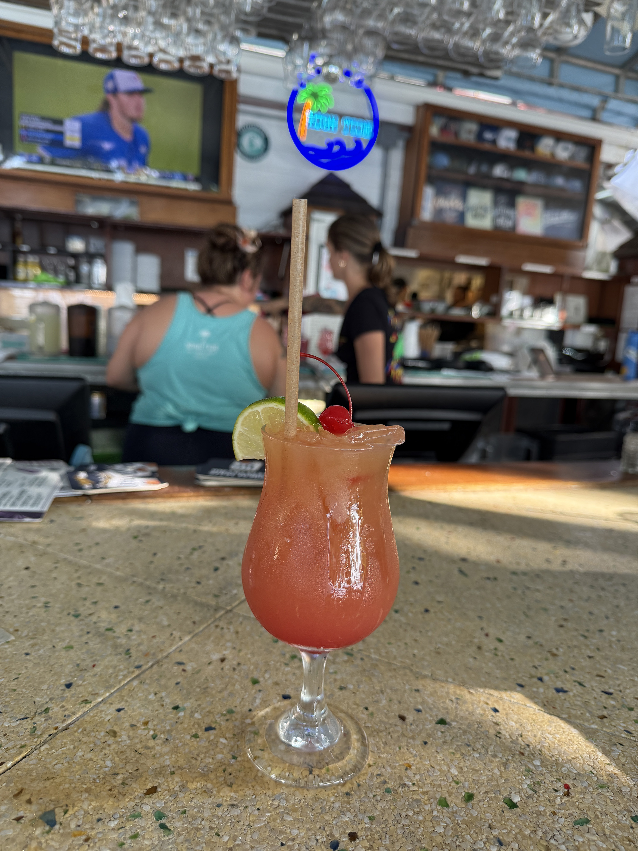 We walked in and up the stairs and I noticed a guy playing guitar. Nice I thought to myself (always enjoy live music whenever we are given the opportunity). There were several other people there at the bar, but there was enough room for us to all sit together on the corner. Since I had the rum punch and then the bushwhacker, I thought a safer bet to order would be a Surfside.