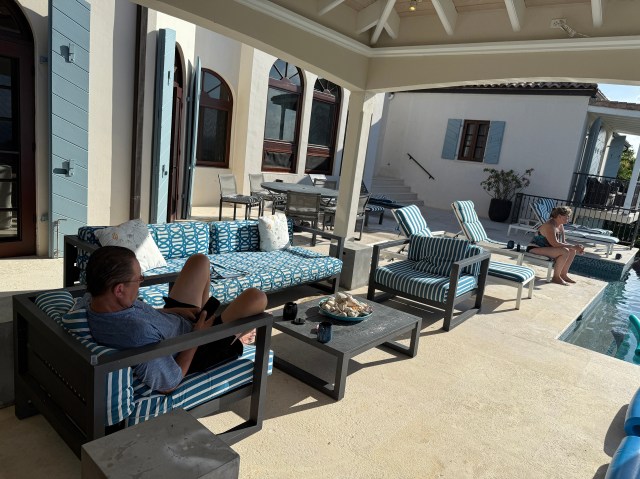 There is a partial covered outdoor seating area which helps to protect against the sun or the random rain shower. Next to the outdoor seating area, there is a working outdoor sink and a compartment containing snorkel gear but it looked like it had seen better days so we didn’t use any of the snorkel equipment. Speaking of seeing their better days, the outdoor furniture itself could use an update. I found it to be worn and honestly not that appealing. For the price we paid for Leeward, you would expect it to have better furniture.
