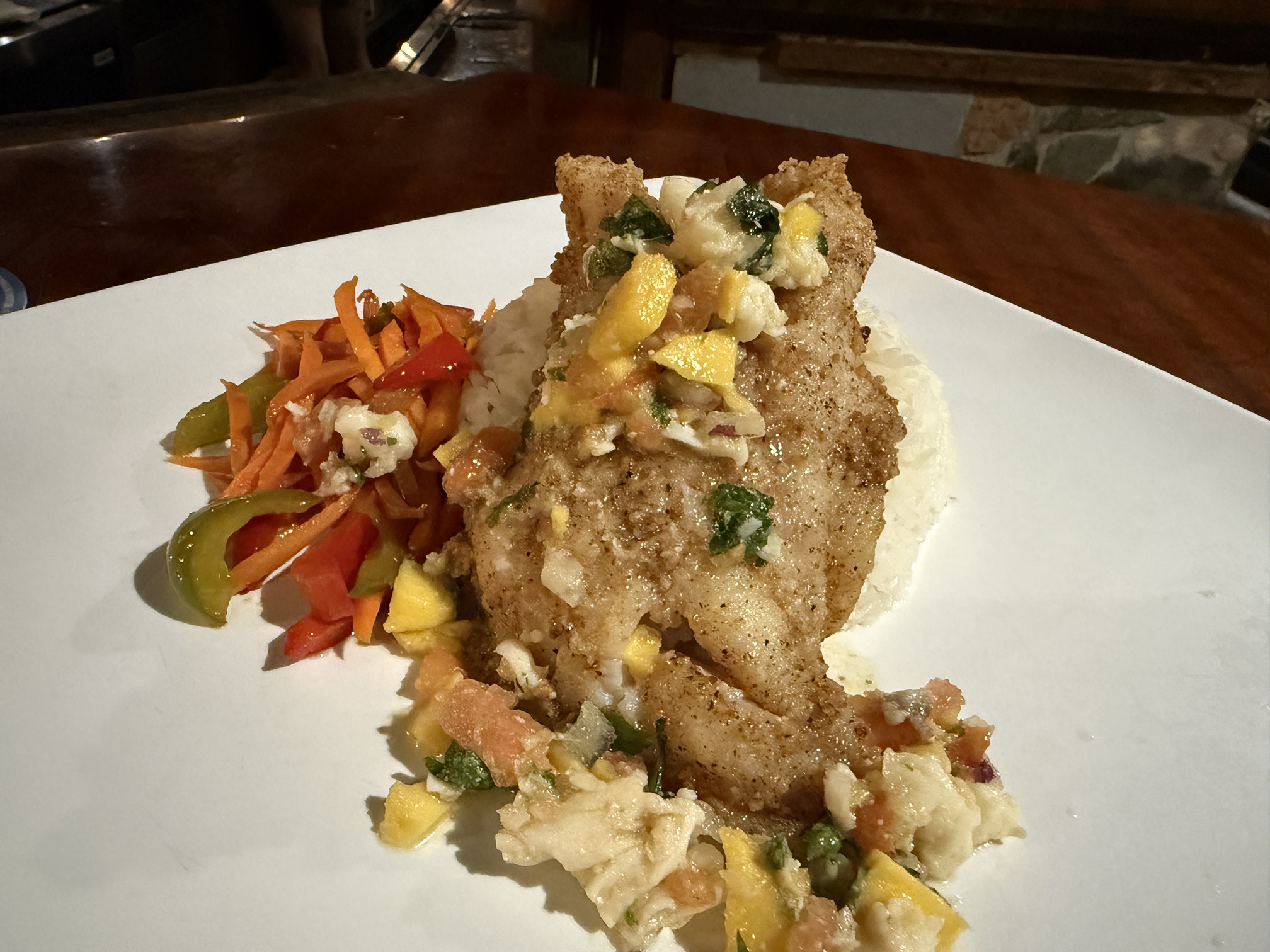 Our appetizer didn’t take long to come out and it looked interesting. I took a taste and it was tasty with the dried cranberries and what not. Would I order it again? Probably not but it was healthy – right? Shortly after that, our main meals arrived. The grouper looked delicious. I think this was the only meal we had the entire trip where it would be considered a sit down dinner type of meal.