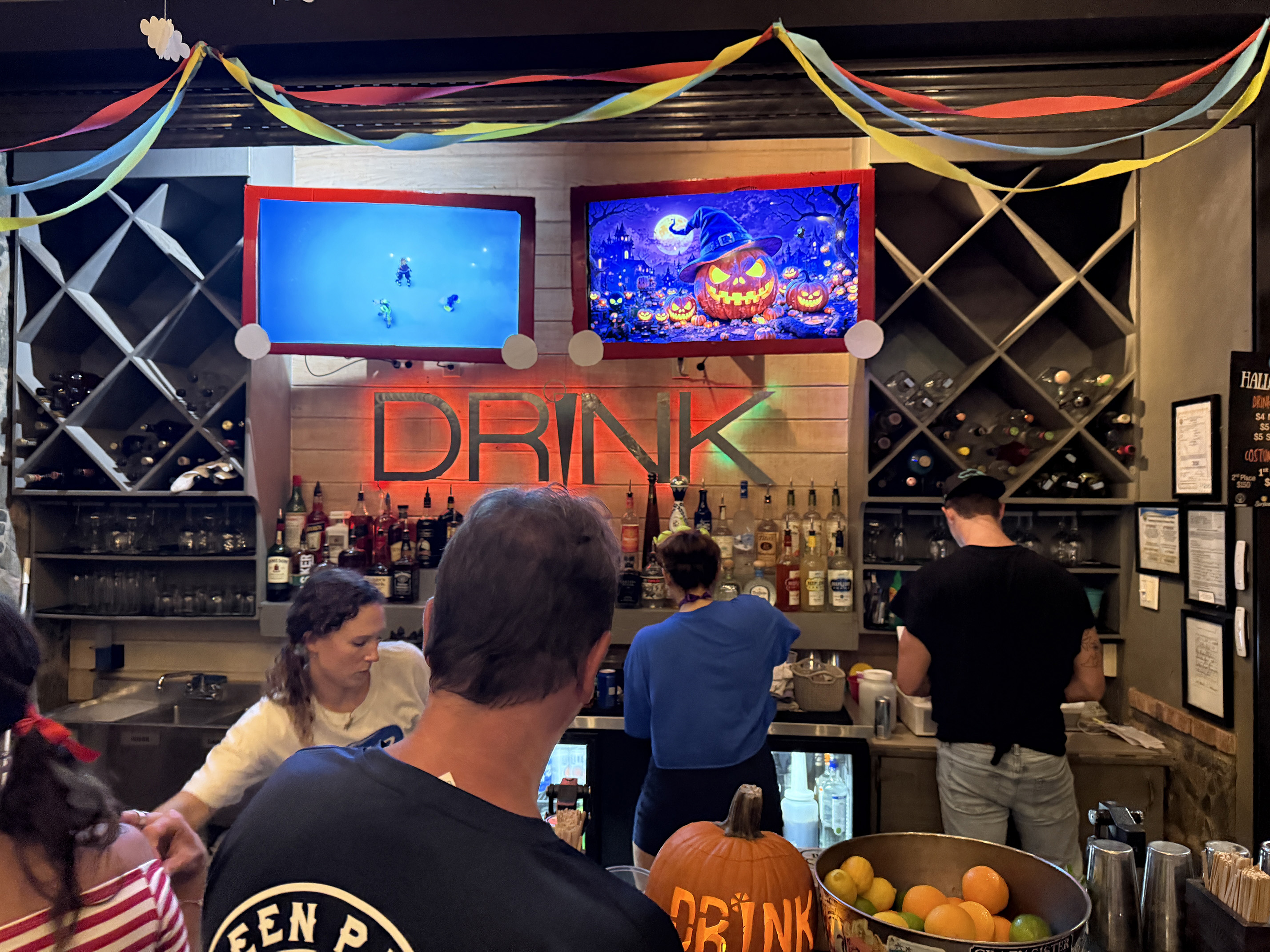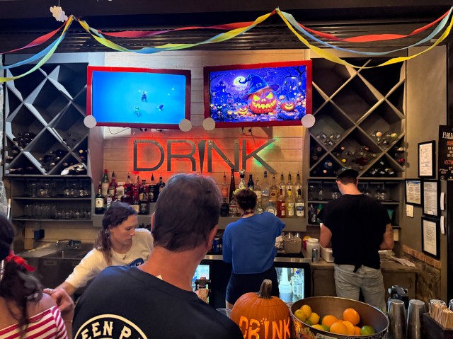After we made it through Karma, we made it to the Beach Bar. There was a band playing and people were all dressed up for Halloween. I then remembered that they were having a Halloween Bash as well. Looking around, there was no place to sit or even stand. With that notion, we walked down towards Drink. When we arrived, it was also busy, but we were able to order a drink at the bar and grab a table. Again, people were all dressed up in their Halloween costumes. It was quite festive. I saw a group of people dressed up wearing the Savannah Banana uniforms and it reminded me back when we went to see Pearl Jam in Nashville in May and how we saw so many people wearing the Savannah Banana gear. I had no idea who they were and my husband told me about them.