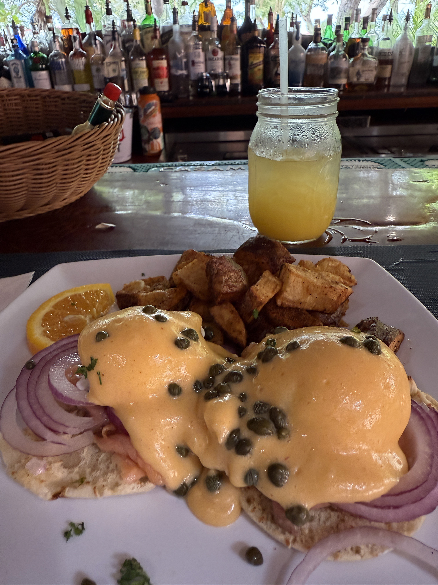 So when the taxi stopped, we got out as well. We paid the driver and walked into the restaurant. When we walked in, we noticed it was the same bartender from the day before. We wound up sitting in the same seats. He remembered us and I thought to myself, please don’t take hours for our drink orders. I ordered a screwdriver and so did my husband. Again it took a while and I couldn’t understand why. The place wasn’t really crowded but when the bartender returned he said that they were out of orange juice.