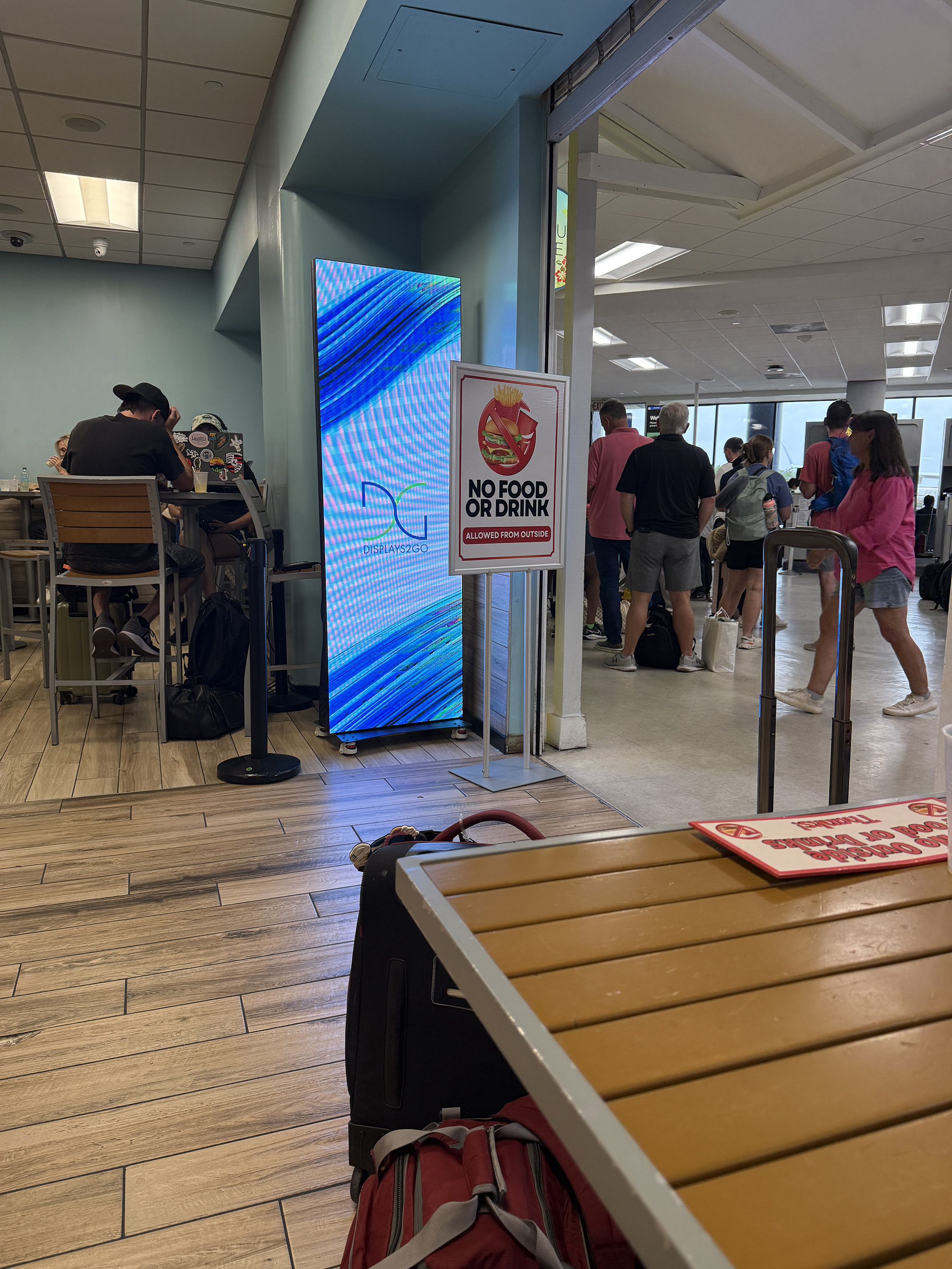 In a way we timed it perfectly. We only had about an hour before we were scheduled to board. I couldn’t believe how it all worked out. Soon it was time to go on line to board. We were in Group 1 so we went in line to wait. Our friends were in Group 4 so they stayed at the table until their group was called.