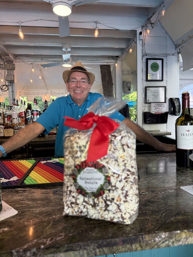 After all our things were put away in their appropriate places, we met Brent and Julie again at the pool bar. While we were talking, Rhoda came out with a bag of gourmet popcorn.