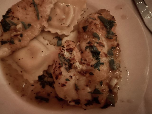The bone marrow definitely needed to be accompanied with some bread because to me it was a bit on the underdone side. I did manage to get through it but would probably stick to a caesar salad to start the next time. Then our main course arrived and it the fish piccata did not disappoint. It was a perfect blend of garlic, capers, olives, and lemon.