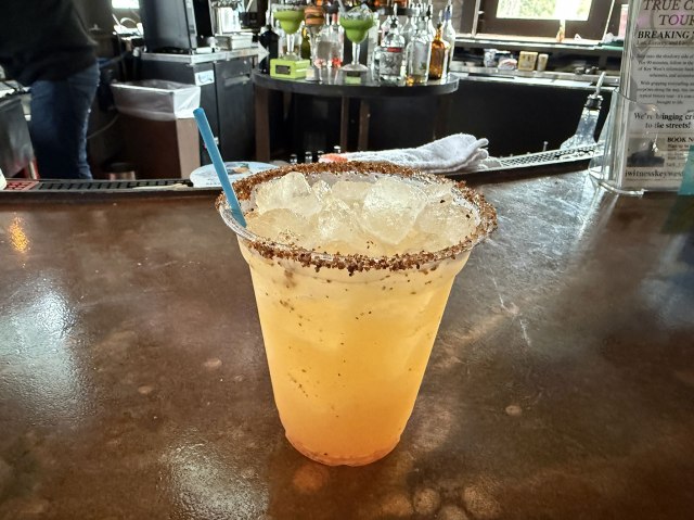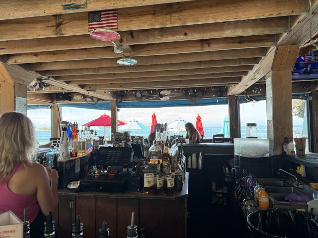 With our bellies stuffed, we walked back out to the street. And there was that wind again. We weren’t too far away from the Sunset Tiki Bar, so of course that was our next course of action. Once again, Candace was behind the bar trying to stay warm. This time all the tarps were down surrounding the area. It definitely helped with the wind, but it was still cold. She served us our go-to drinks – Deep Eddy Sweet Tea with water and lemon. It was tasty but didn’t exactly help warm us up.