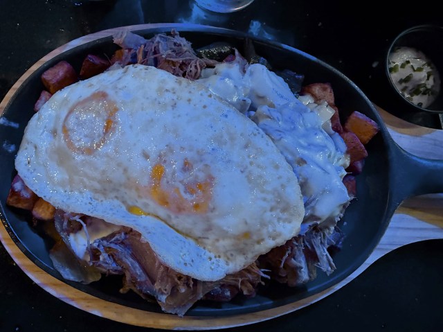 When our name was called, we walked back in to Breakfast Club Too and it was filled to the nines. The hostess walked us to a back table and ironically it was the same table we dined at the last time we were there. What are the odds? I peeled off my layers and settled into my chair. It was warm inside and I was ready for a hot meal. The server came over and took our orders. I went ahead and ordered one of my favorites there – the rösti. I usually order the chorizo version, but this time I felt like the pulled pork. They both were similar, prepared with poblano peppers.