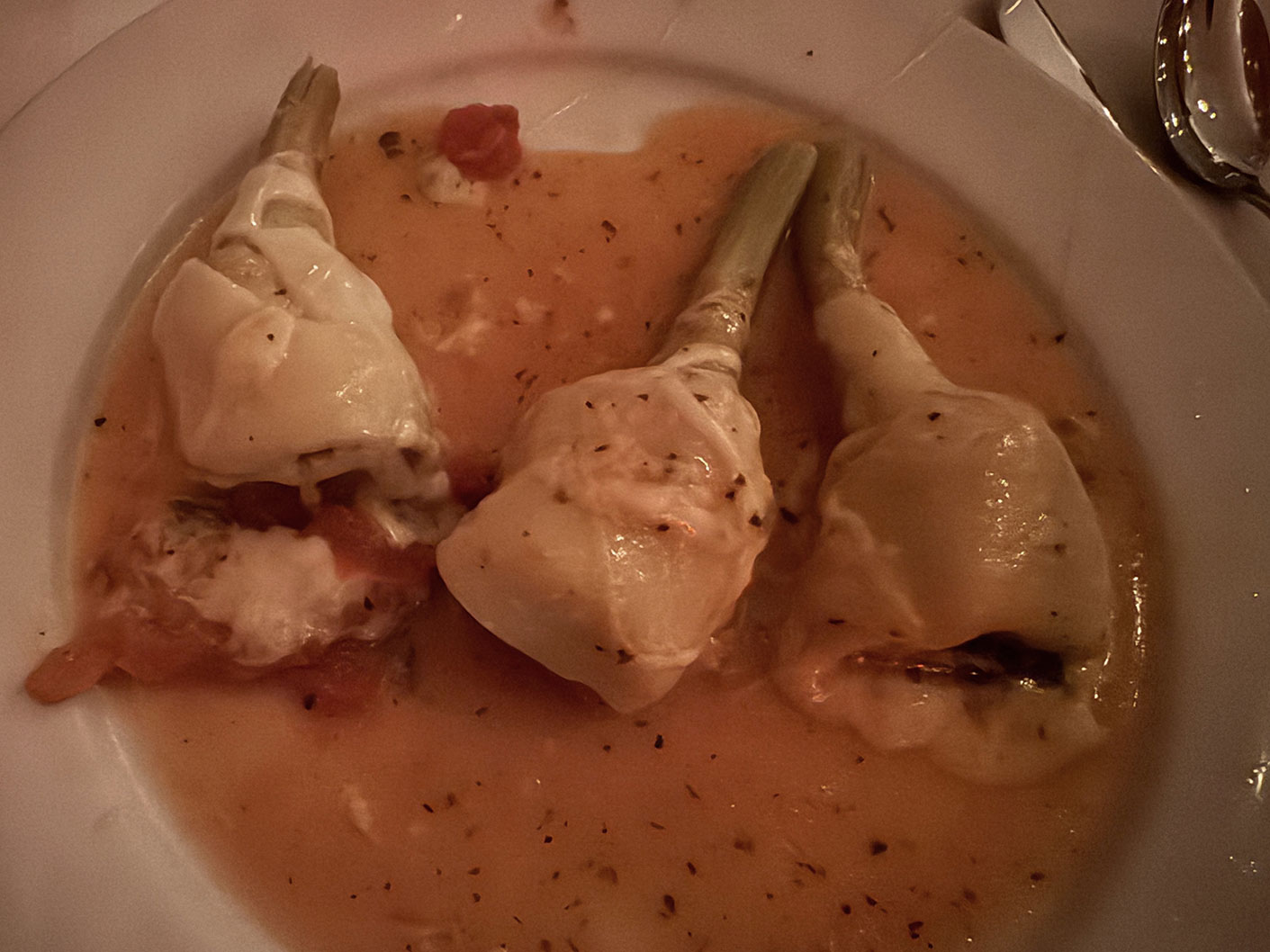 They had 5 appetizer options and 5 main course options. My husband and 2 others in our party ordered the lobster tempura appetizer to start. I went ahead and ordered the braised artichoke hearts. Then for the main course, I ordered the hogfish and so did my husband. There were also other seafood options as well. They even offered to put together a vegan pasta dish for our friend Al who has a strict diet.