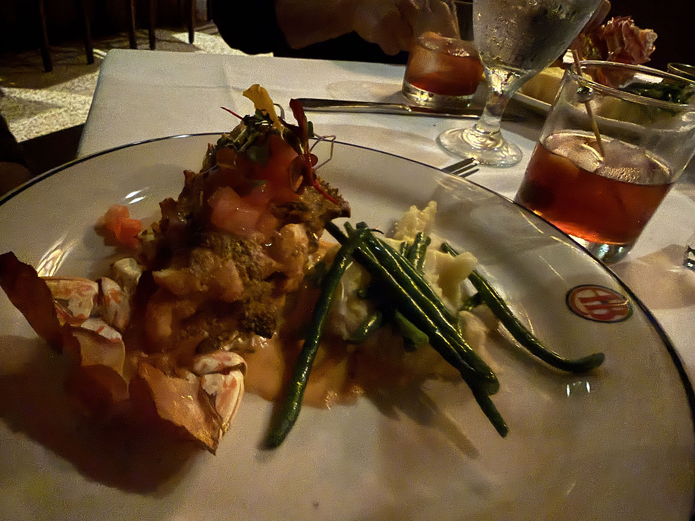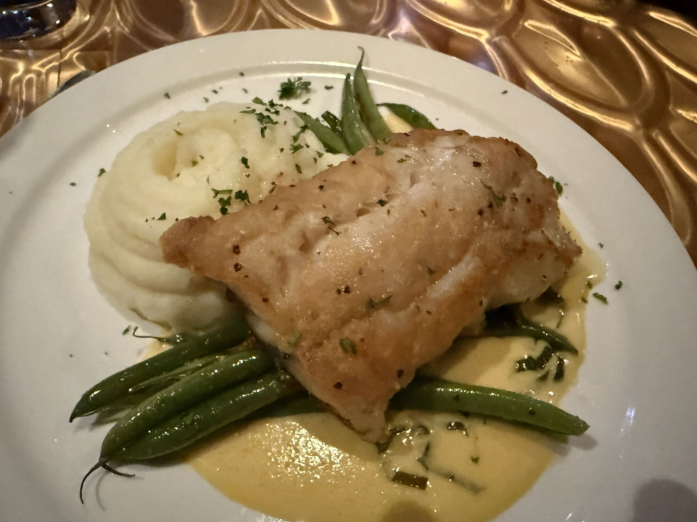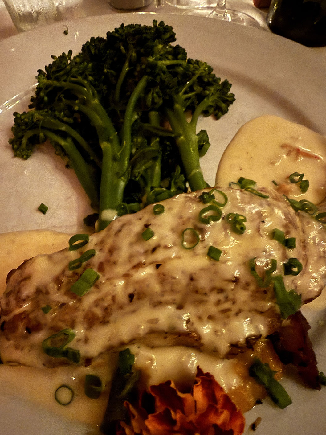 Our main course soon was served. The black grouper looked amazing and it was. The sherry wine sauce was so good, however when I tried the broccolini, there was nothing on them. Maybe one of the cooks forgot to toss them in olive oil? There wasn’t even any salt or pepper. It was like they were blanched in water and put on the plate. Again, the place was really busy so maybe it was just something that was overlooked. We have never had a bad meal there – ever. So with that I did still enjoy everything else.