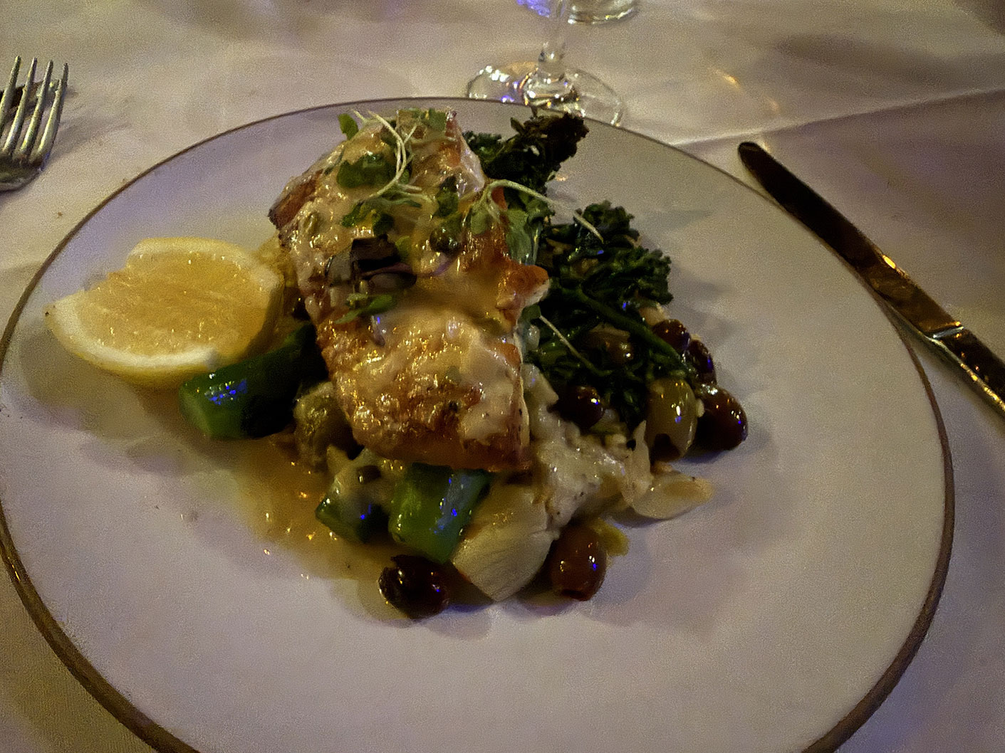 The bone marrow definitely needed to be accompanied with some bread because to me it was a bit on the underdone side. I did manage to get through it but would probably stick to a caesar salad to start the next time. Then our main course arrived and it the fish piccata did not disappoint. It was a perfect blend of garlic, capers, olives, and lemon.